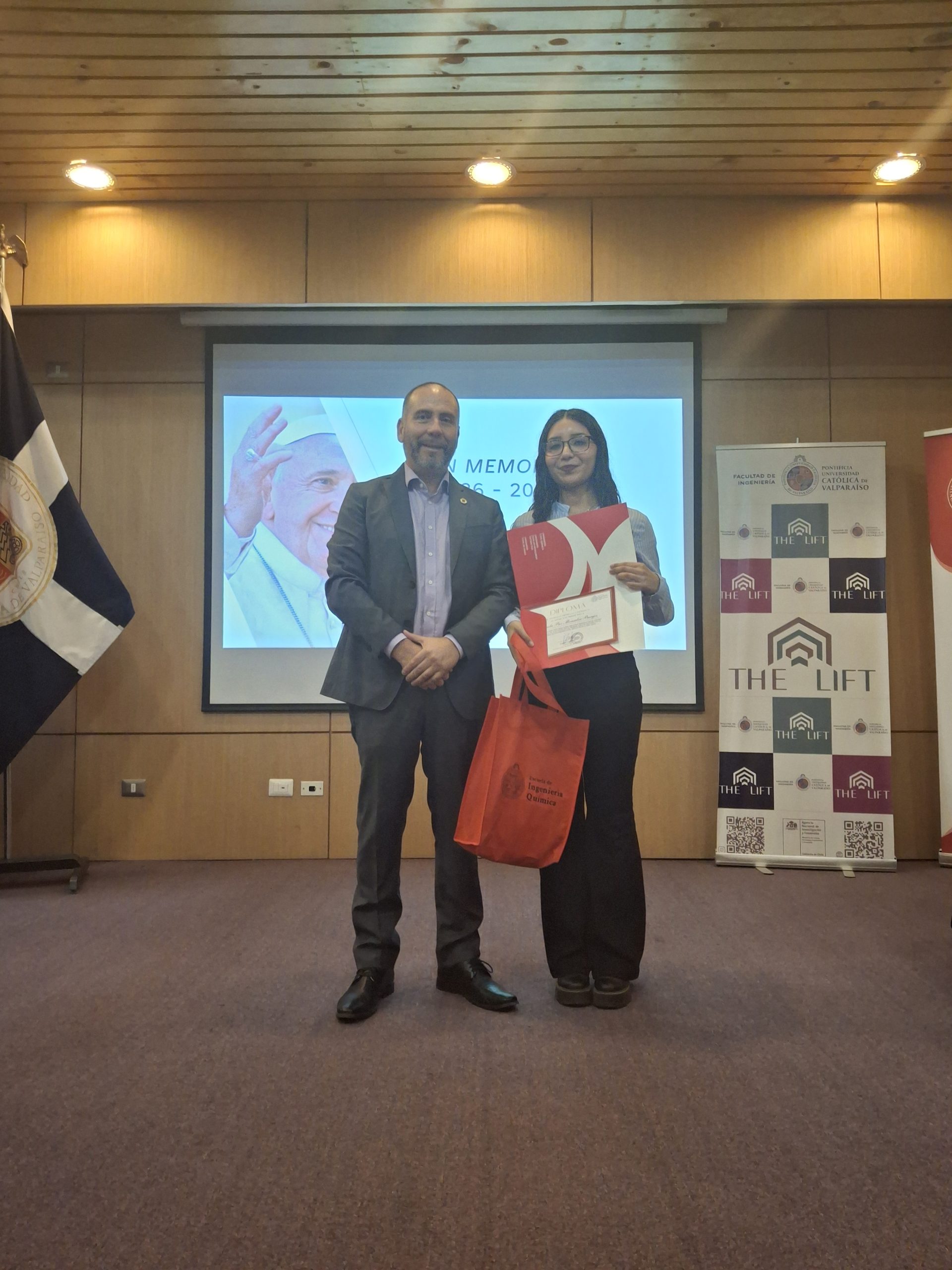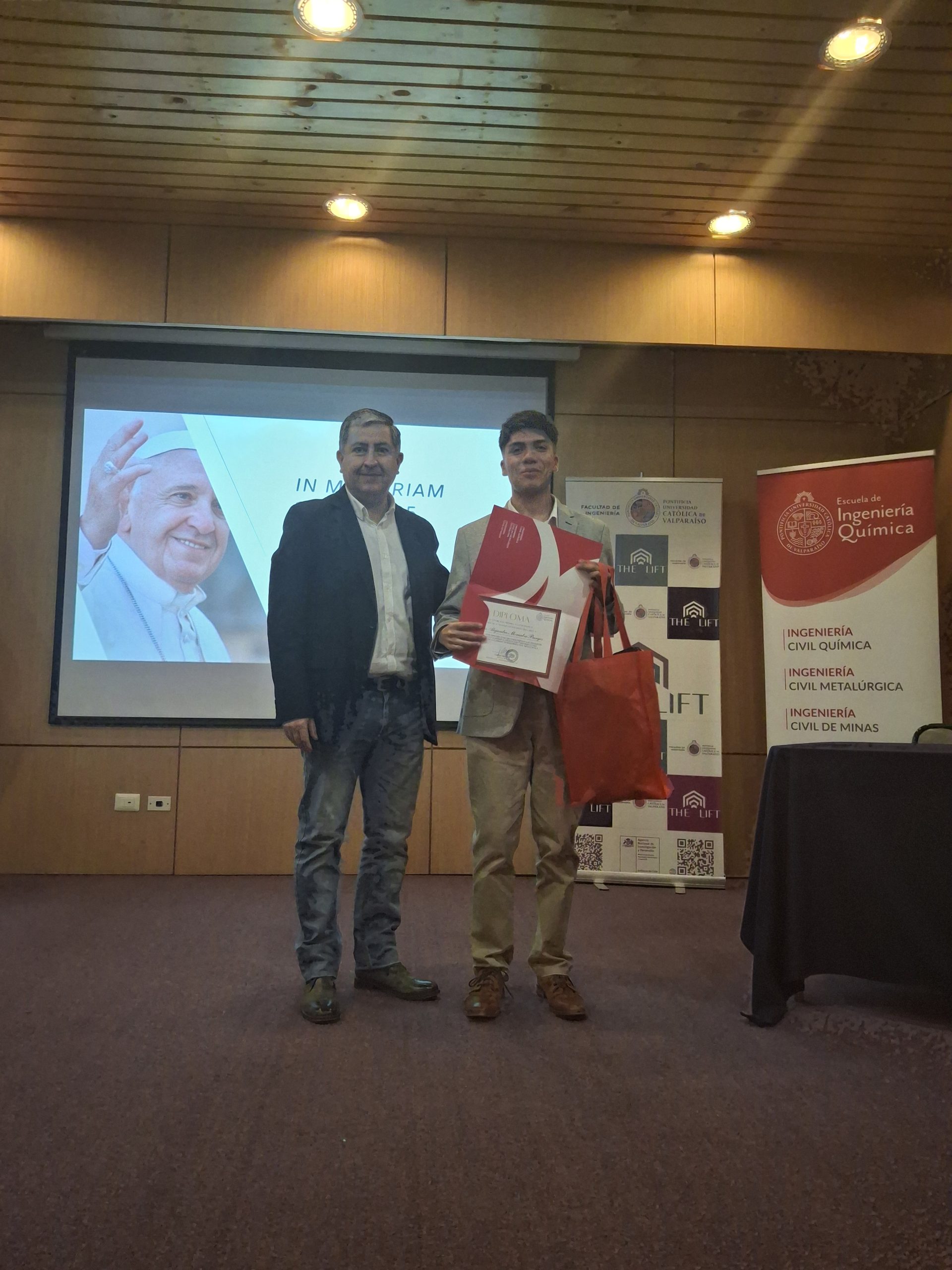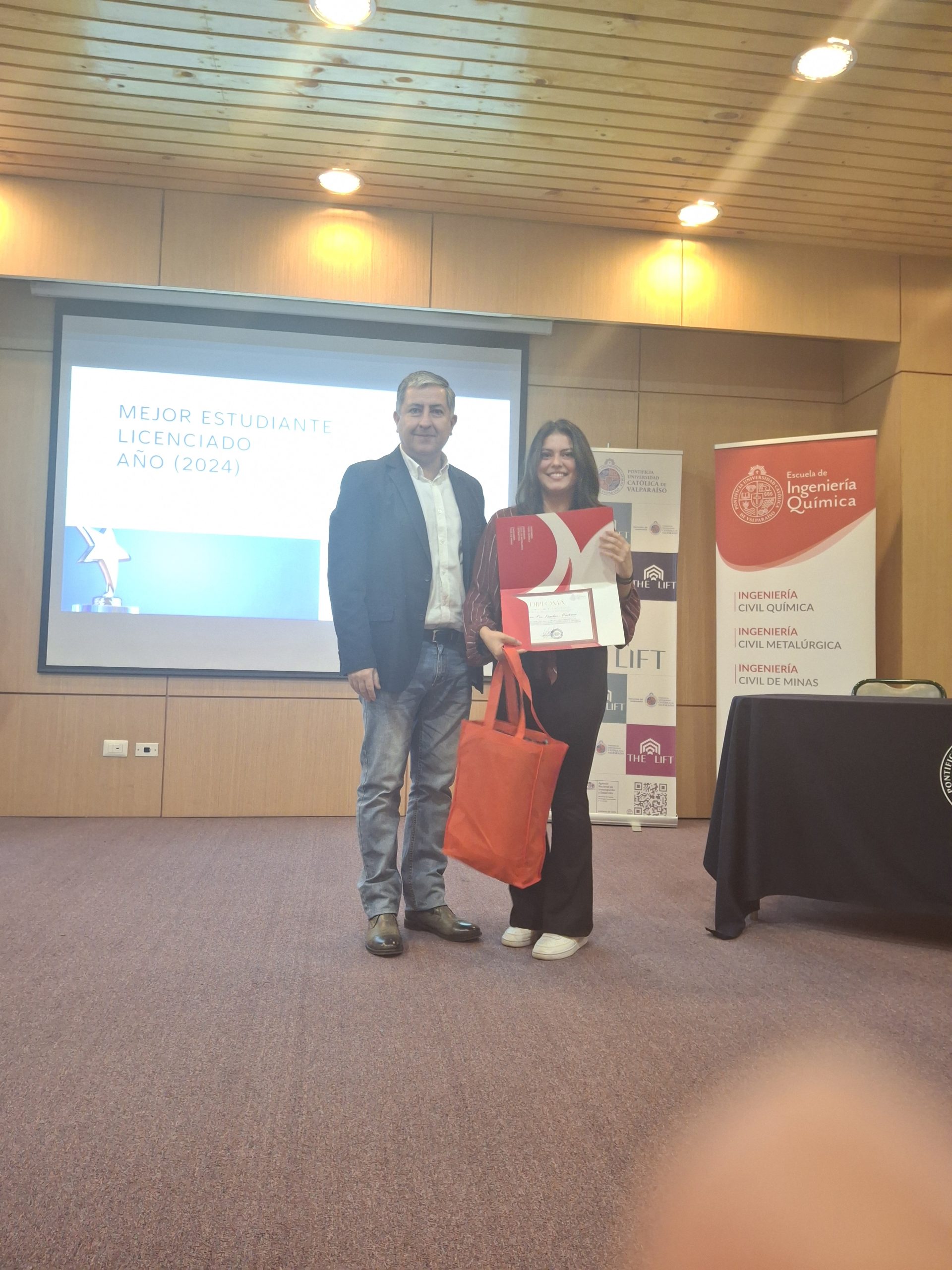 Estos premios fueron entregados por el decano de la Facultad de Ingeniería, Gianni Olguín, y el ingeniero químico Jorge Salgado, miembro del directorio de la Asociación de Egresados de la EIQ, respectivamente.
