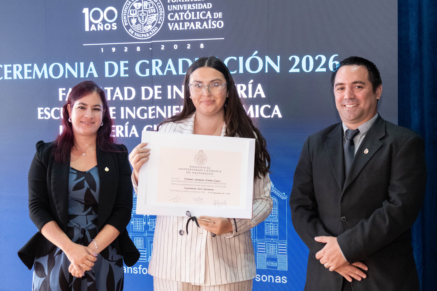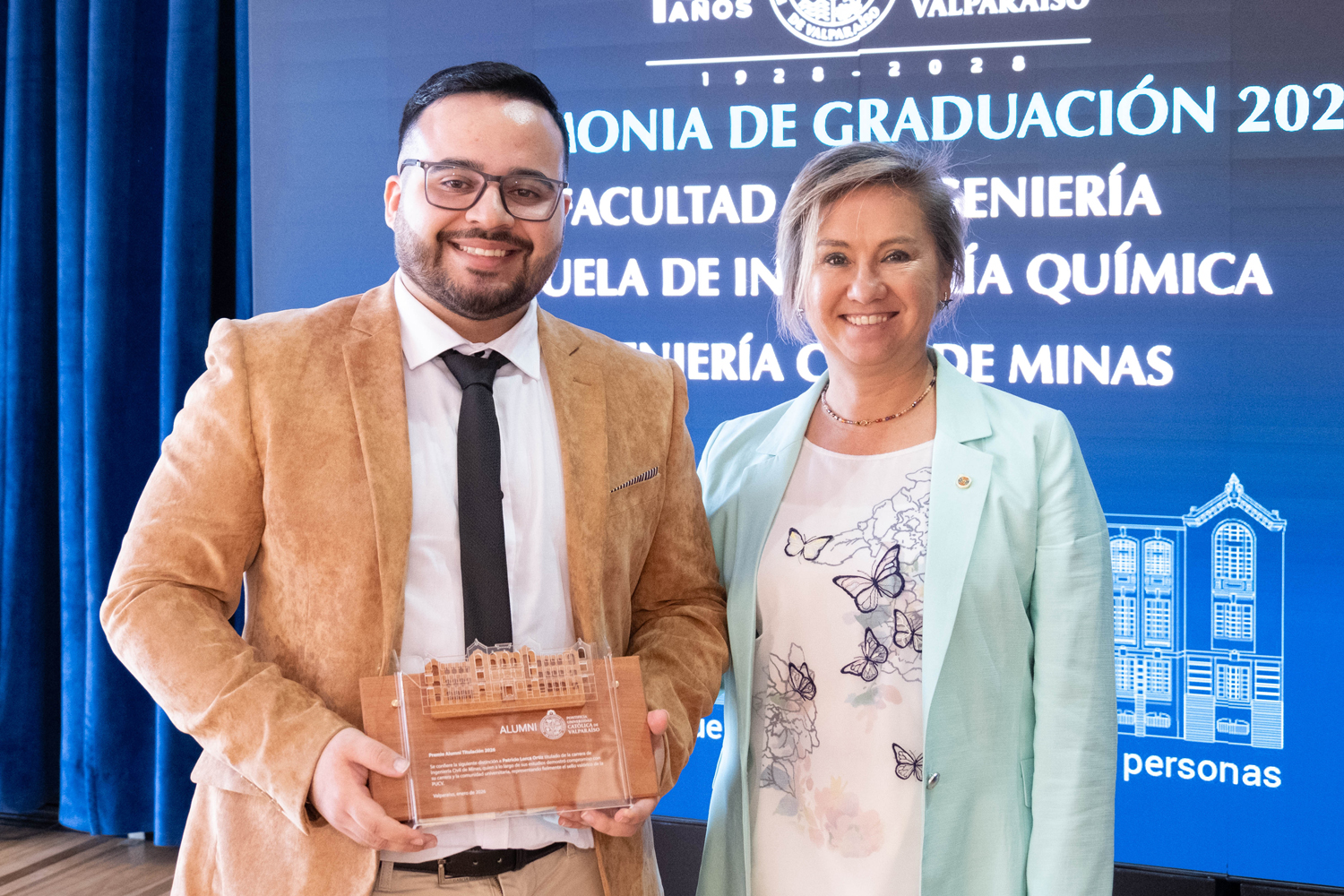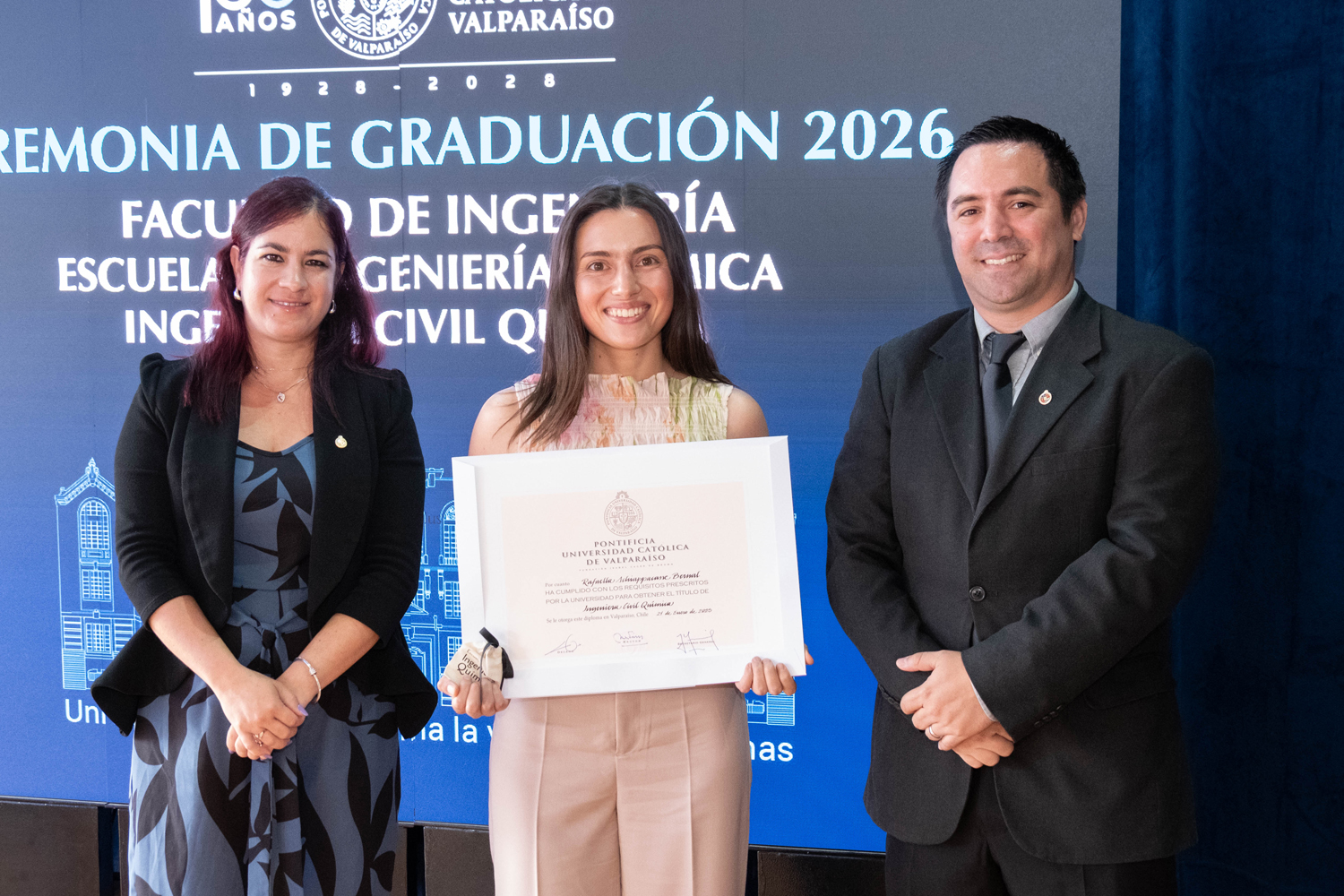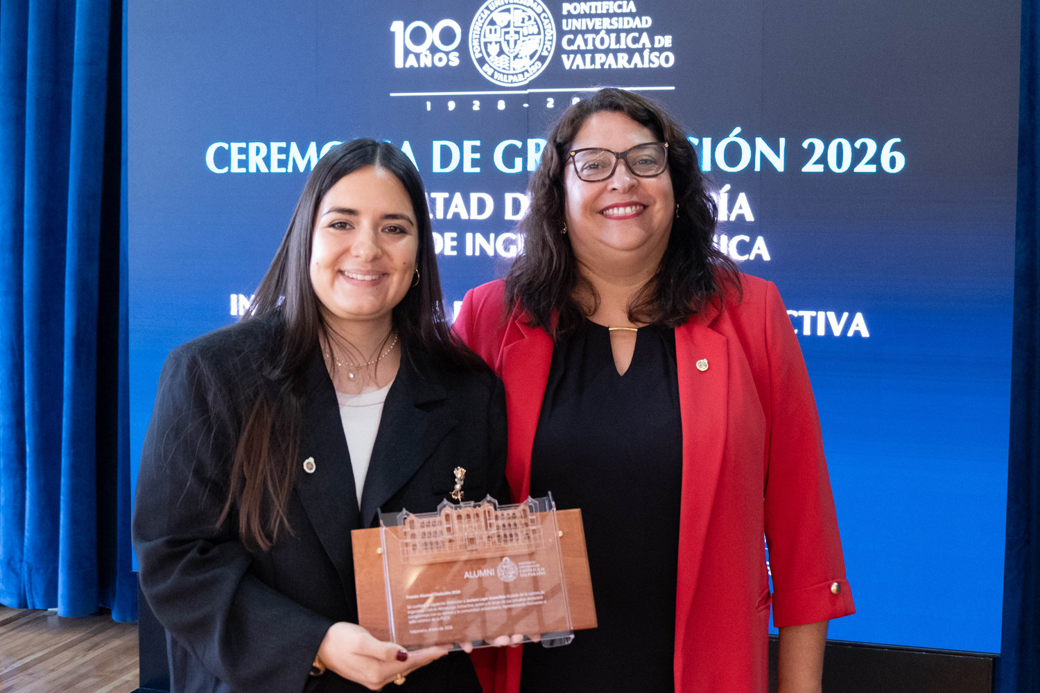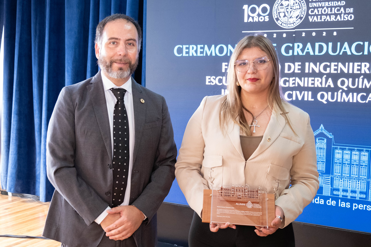 Asimismo, en el marco de las ceremonias se entregaron diversos reconocimientos, entre ellos el premio a la mejor graduada o graduado por carrera de la generación 2025, además del Premio Alumni 2025, otorgado por la Red Alumni PUCV. Este galardón distingue a estudiantes que han demostrado un fuerte compromiso con su Escuela y con la comunidad universitaria, reflejando a través de su trayectoria los valores institucionales de la PUCV.