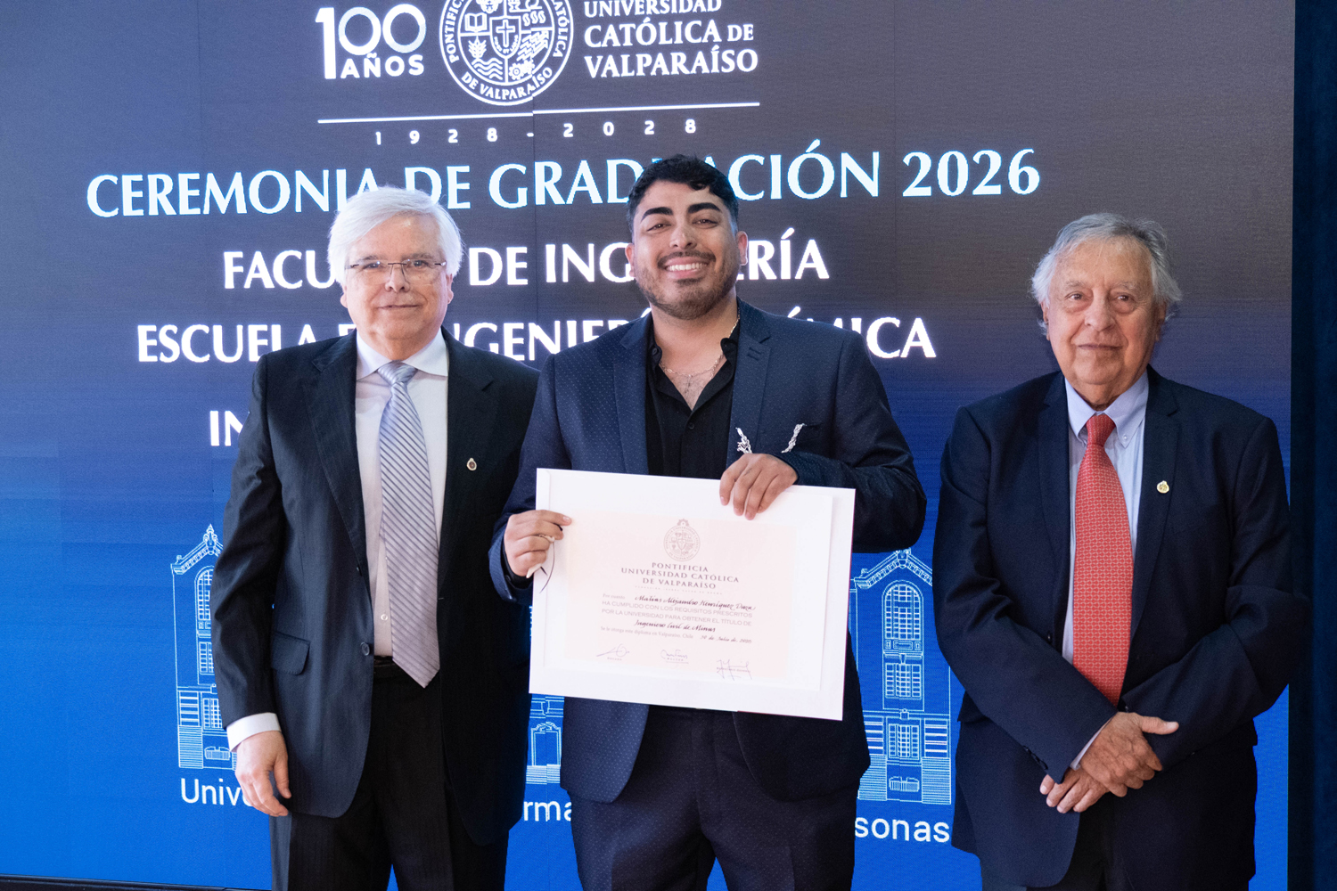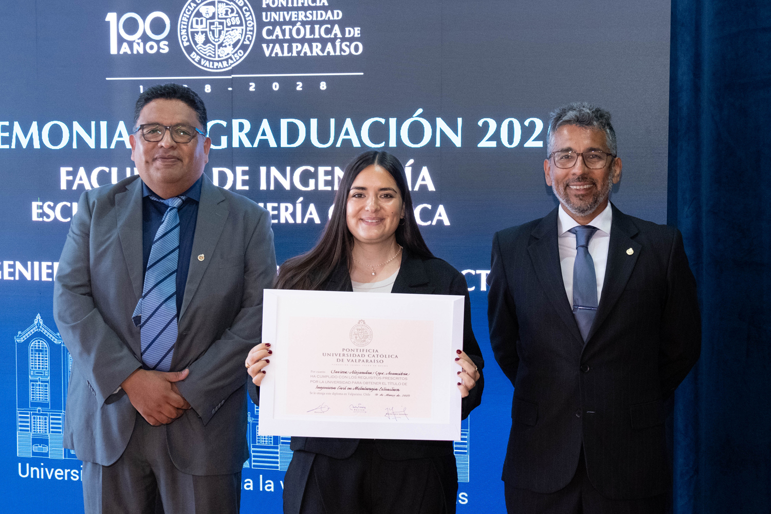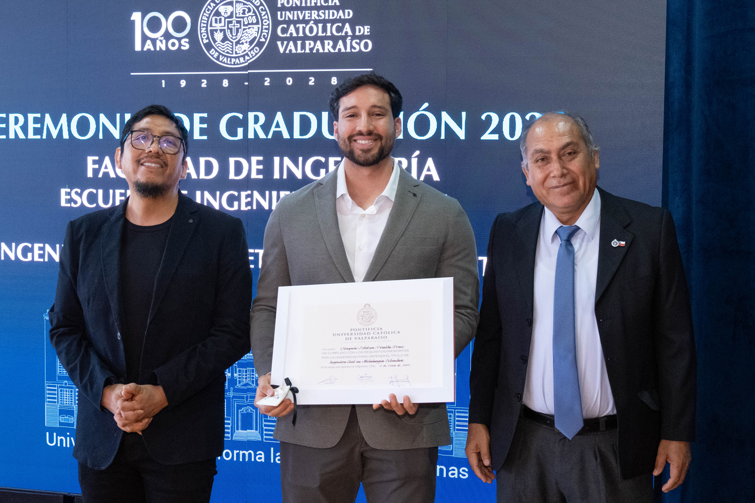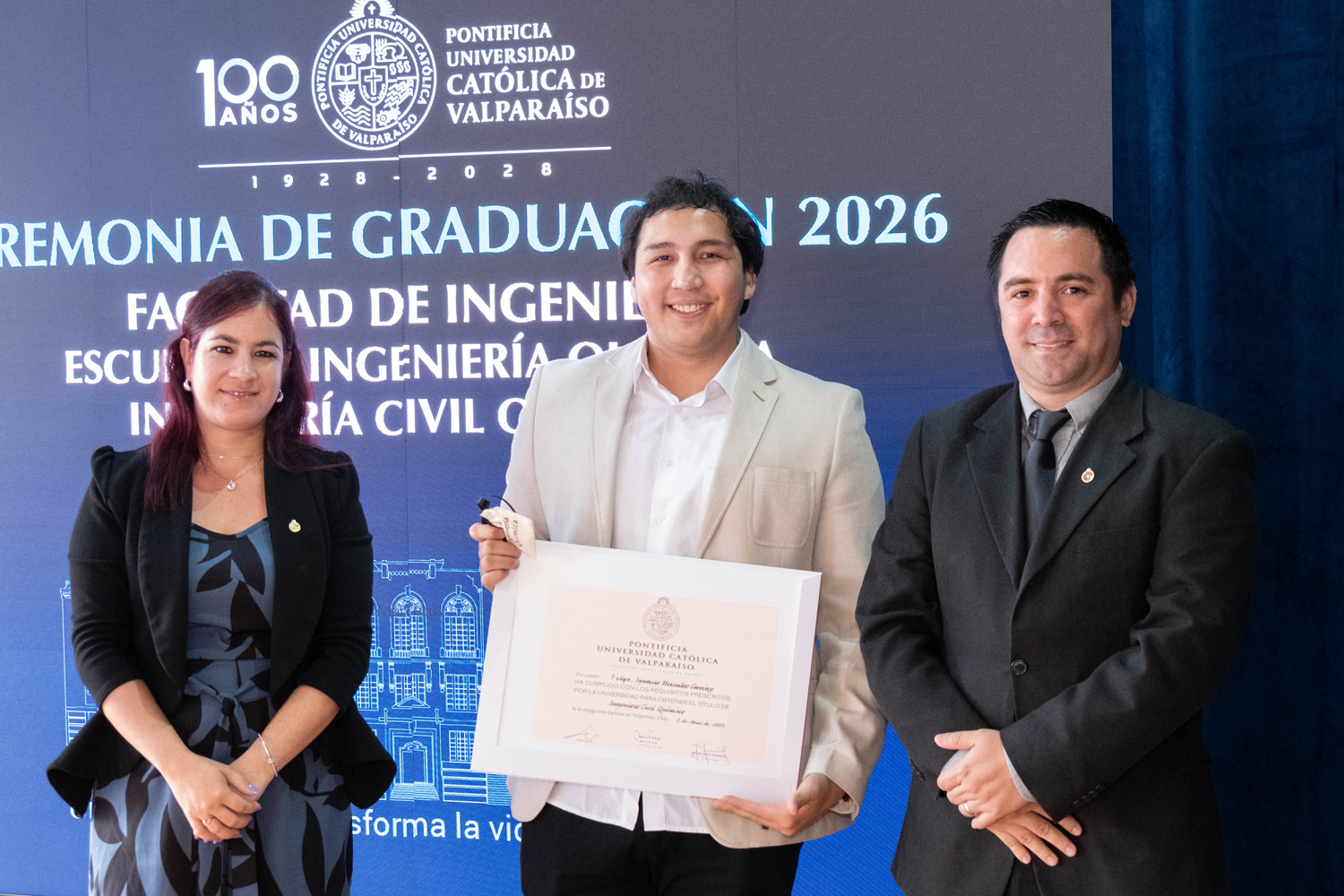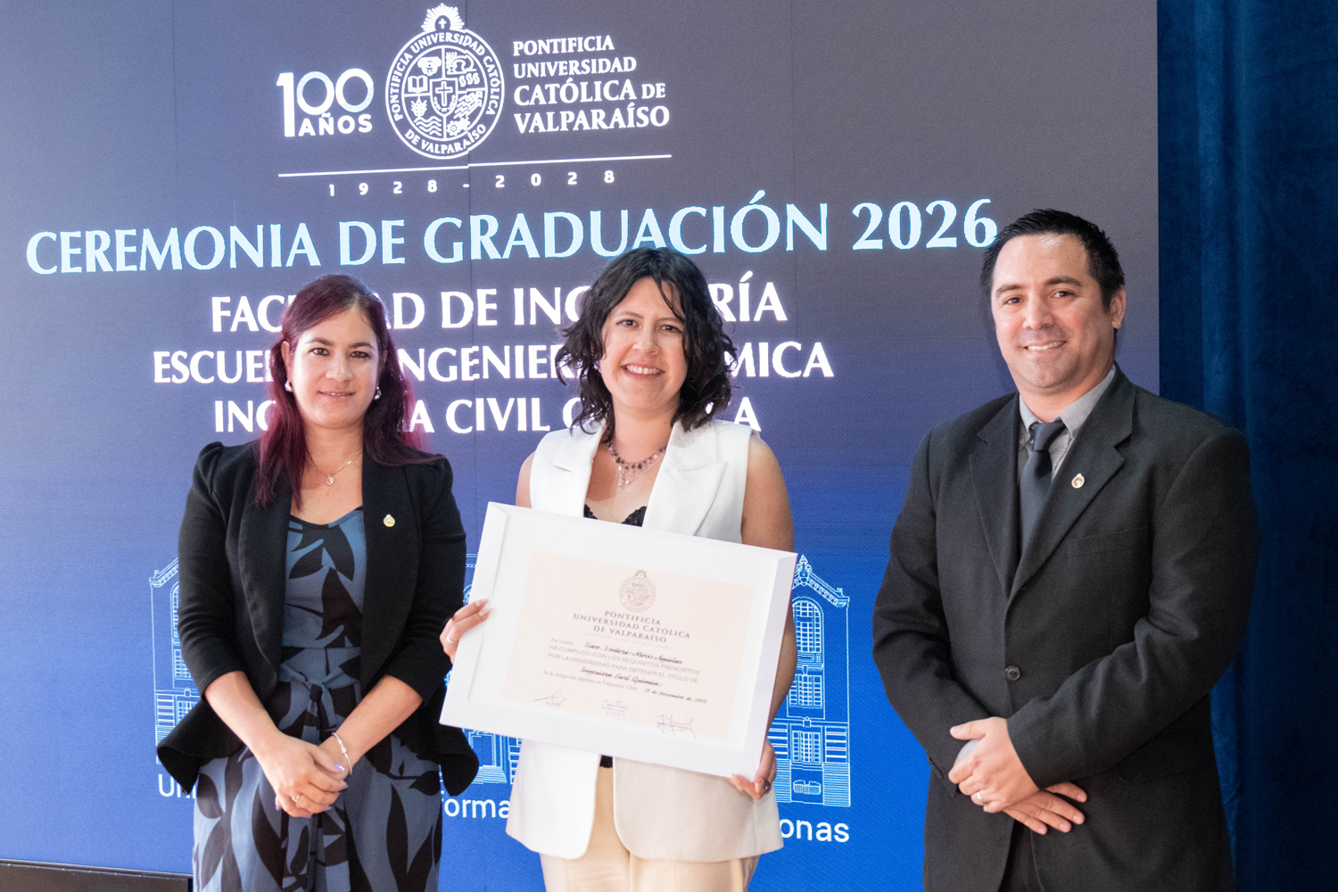 Asimismo, en el marco de las ceremonias se entregaron diversos reconocimientos, entre ellos el premio a la mejor graduada o graduado por carrera de la generación 2025, además del Premio Alumni 2025, otorgado por la Red Alumni PUCV. Este galardón distingue a estudiantes que han demostrado un fuerte compromiso con su Escuela y con la comunidad universitaria, reflejando a través de su trayectoria los valores institucionales de la PUCV.