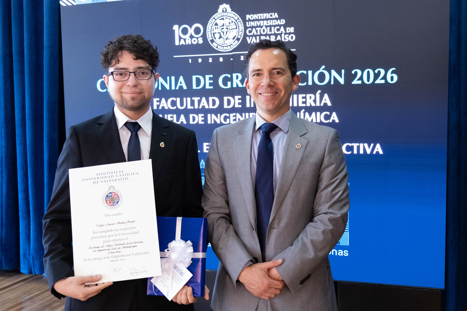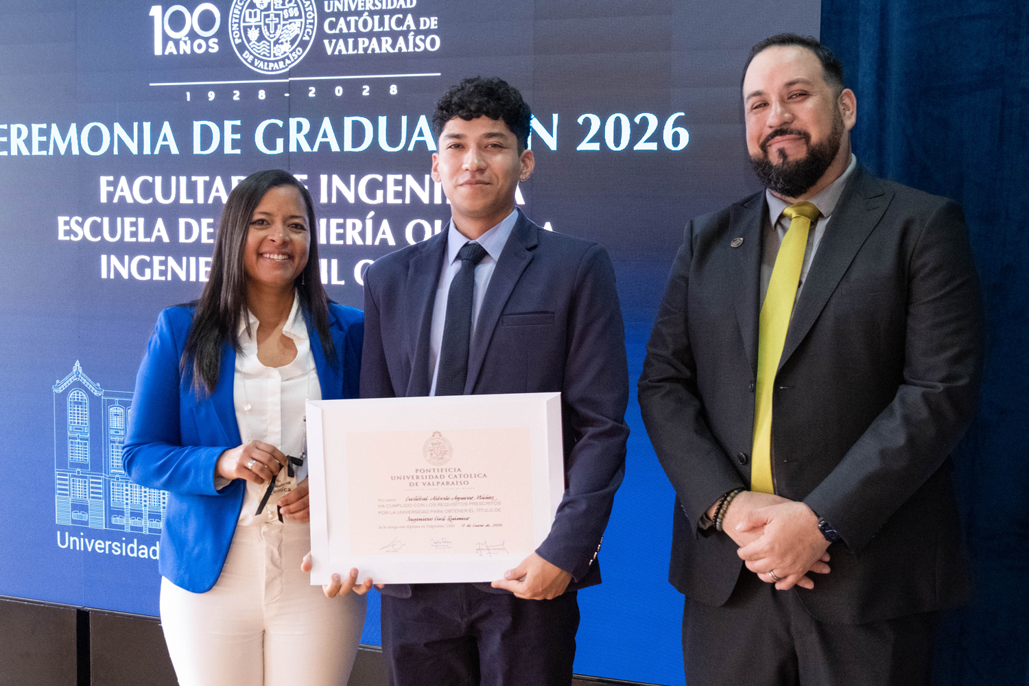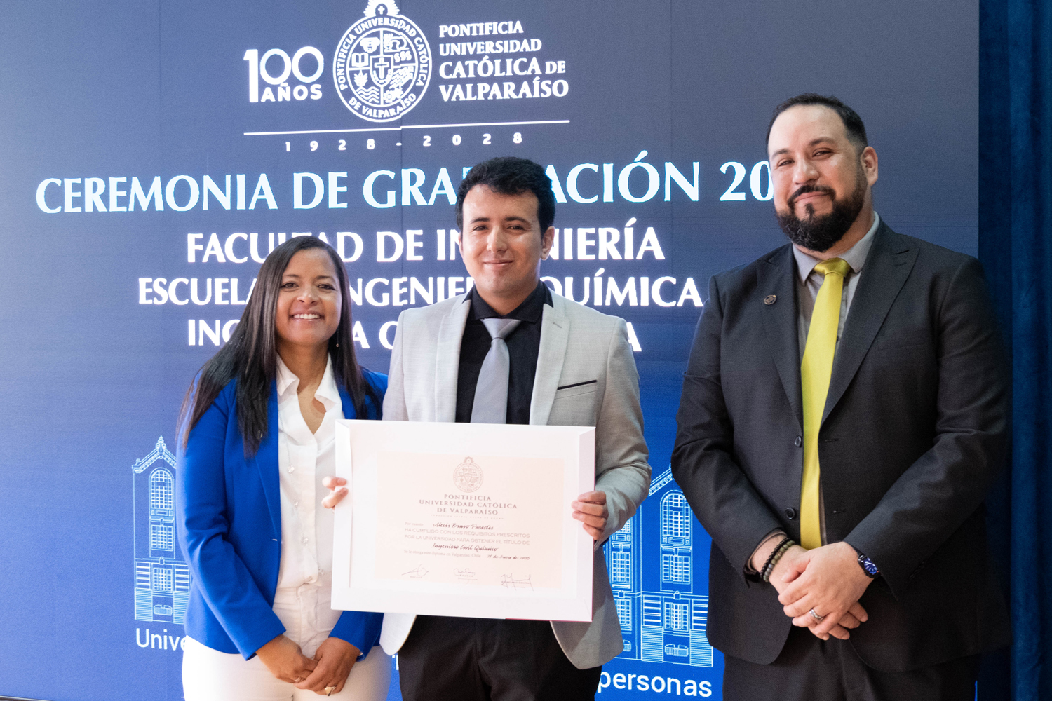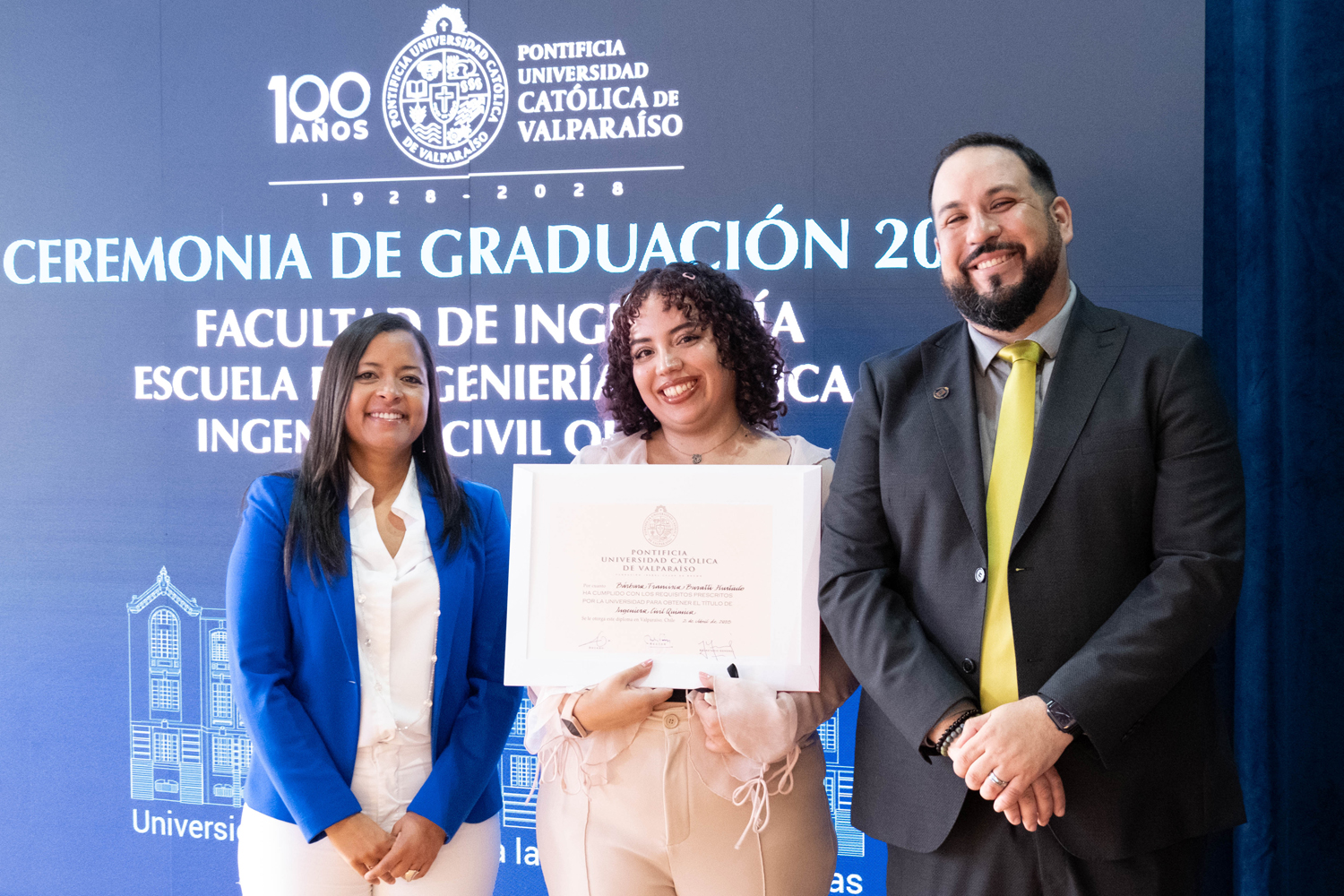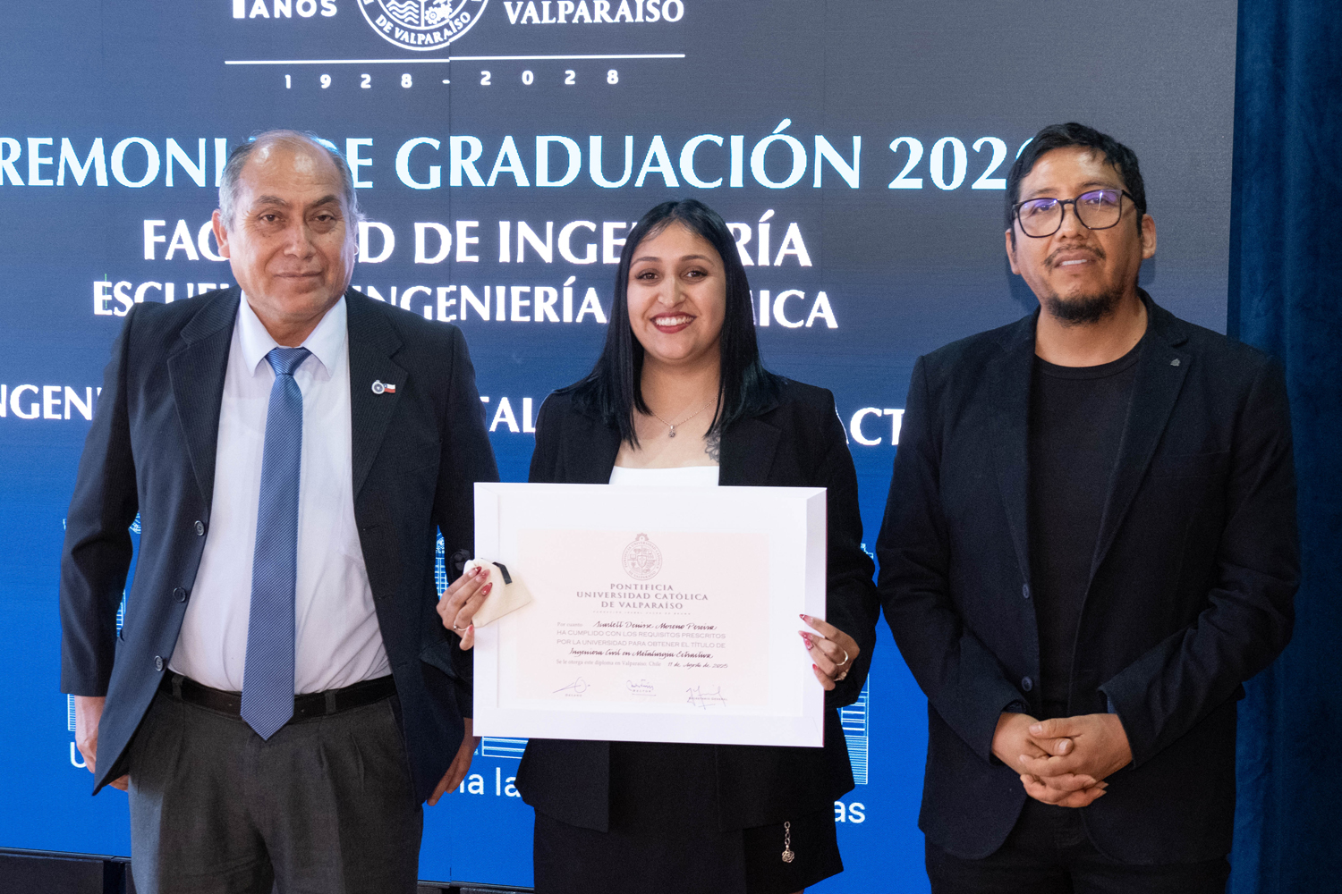 Asimismo, en el marco de las ceremonias se entregaron diversos reconocimientos, entre ellos el premio a la mejor graduada o graduado por carrera de la generación 2025, además del Premio Alumni 2025, otorgado por la Red Alumni PUCV. Este galardón distingue a estudiantes que han demostrado un fuerte compromiso con su Escuela y con la comunidad universitaria, reflejando a través de su trayectoria los valores institucionales de la PUCV.