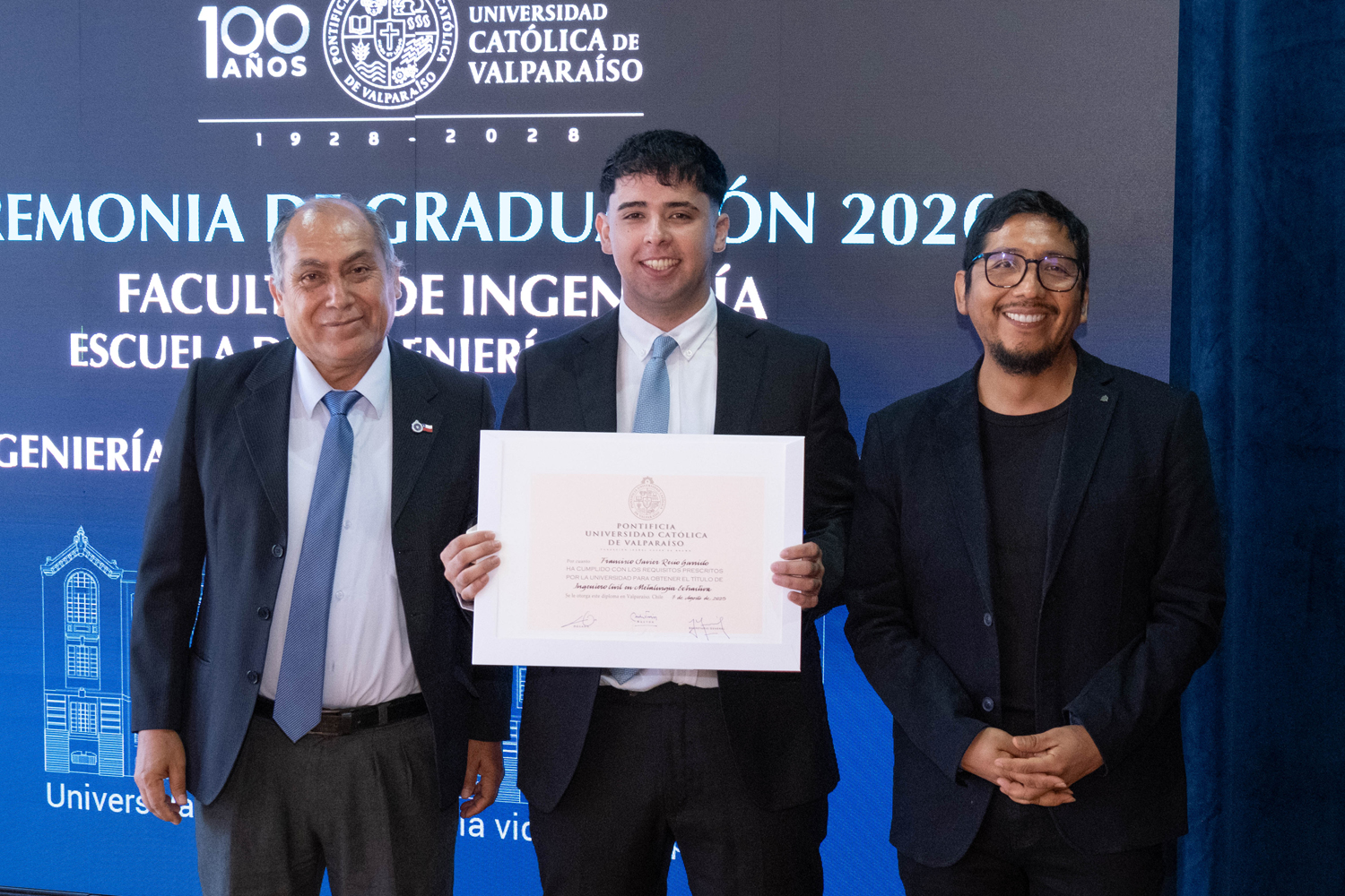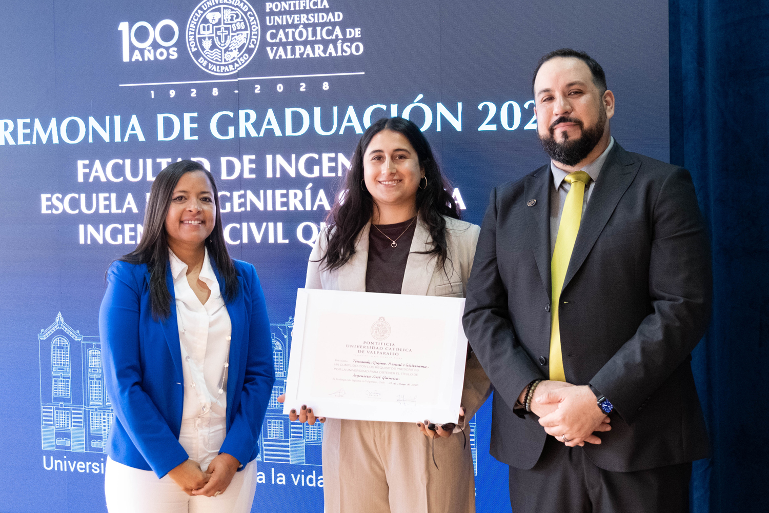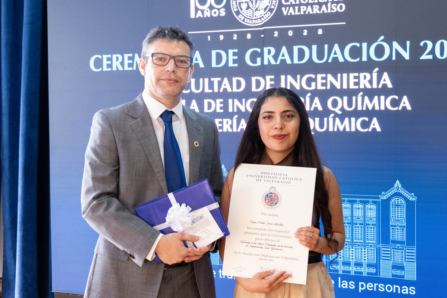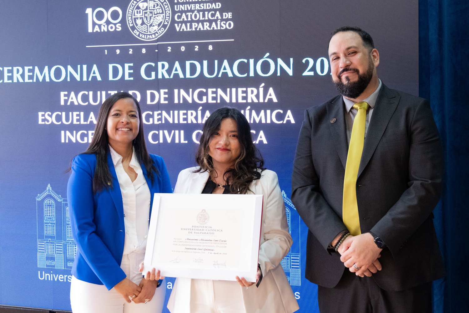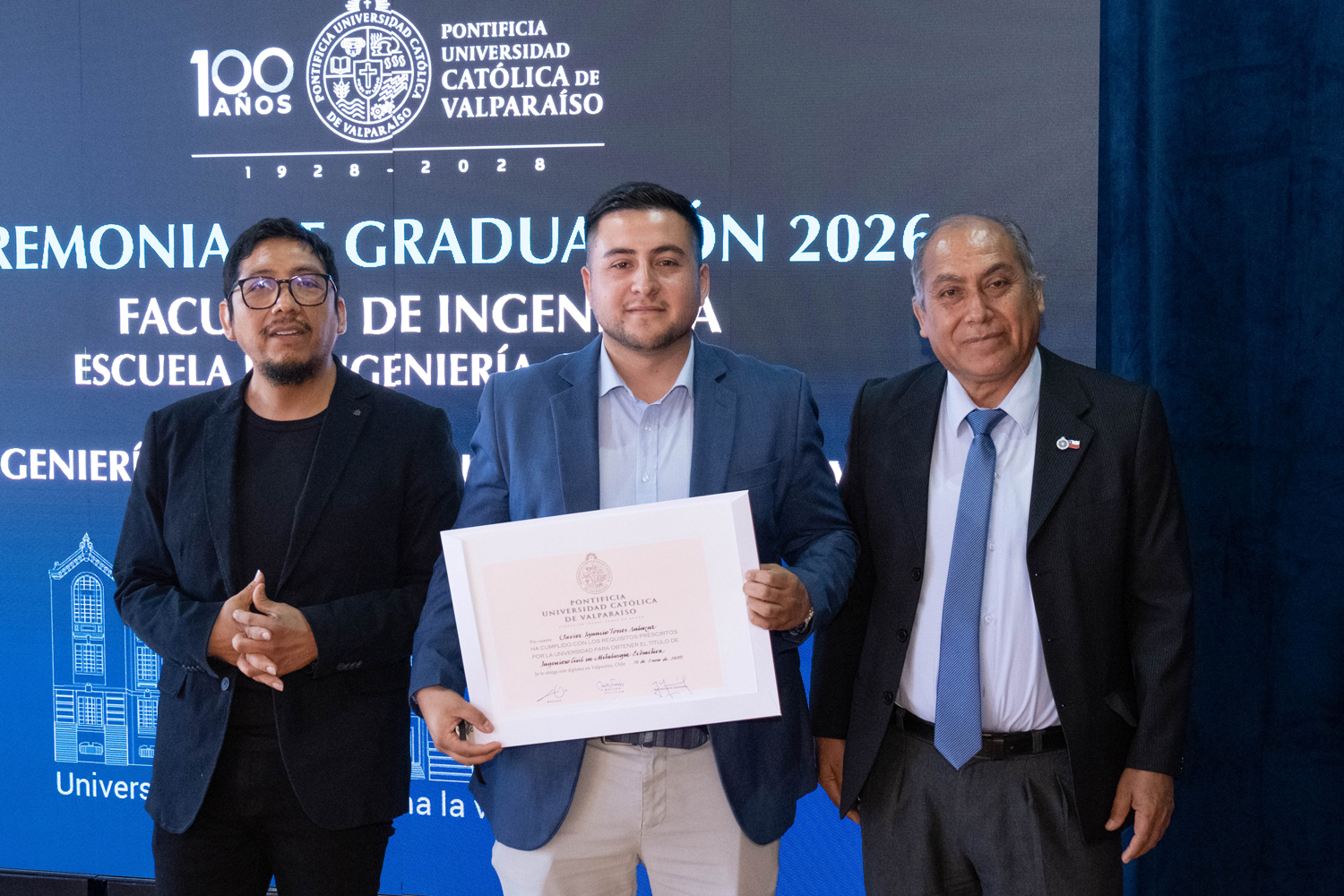 Asimismo, en el marco de las ceremonias se entregaron diversos reconocimientos, entre ellos el premio a la mejor graduada o graduado por carrera de la generación 2025, además del Premio Alumni 2025, otorgado por la Red Alumni PUCV. Este galardón distingue a estudiantes que han demostrado un fuerte compromiso con su Escuela y con la comunidad universitaria, reflejando a través de su trayectoria los valores institucionales de la PUCV.