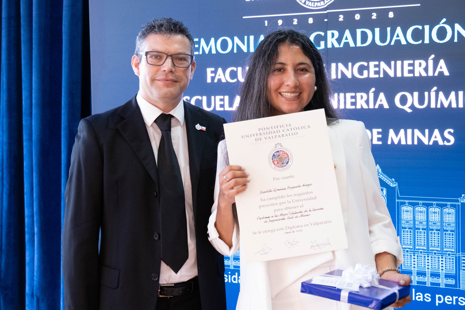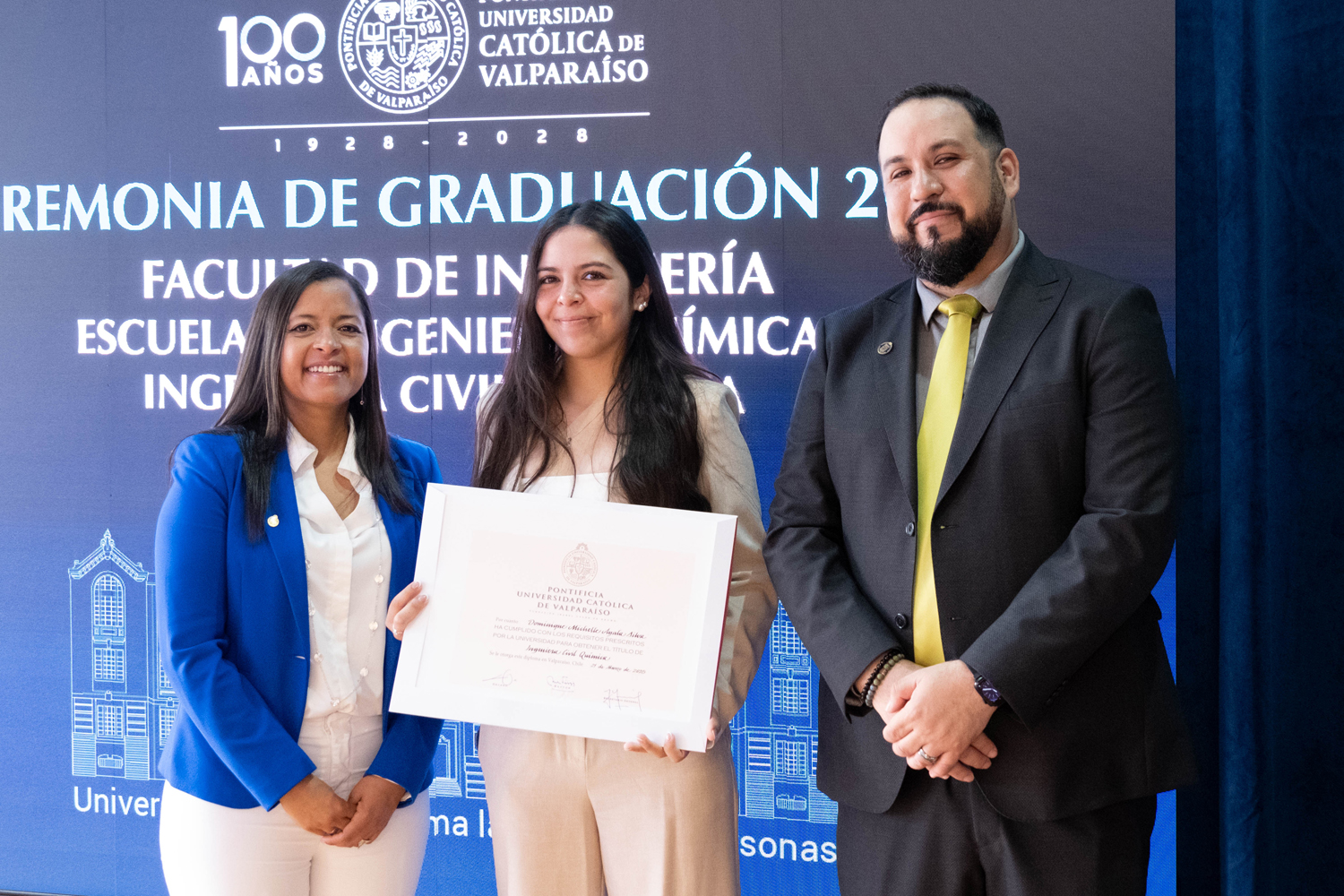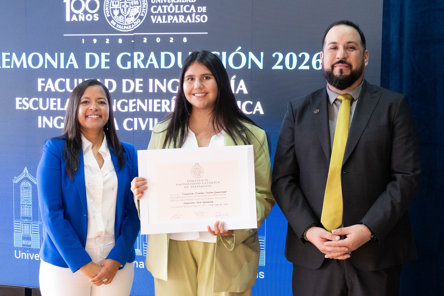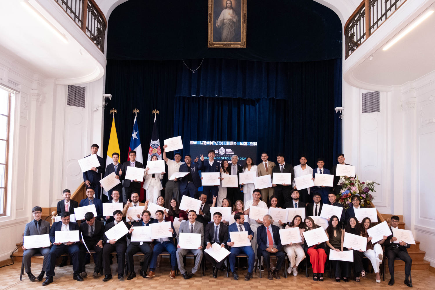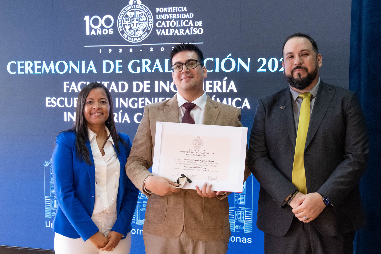 Asimismo, en el marco de las ceremonias se entregaron diversos reconocimientos, entre ellos el premio a la mejor graduada o graduado por carrera de la generación 2025, además del Premio Alumni 2025, otorgado por la Red Alumni PUCV. Este galardón distingue a estudiantes que han demostrado un fuerte compromiso con su Escuela y con la comunidad universitaria, reflejando a través de su trayectoria los valores institucionales de la PUCV.
