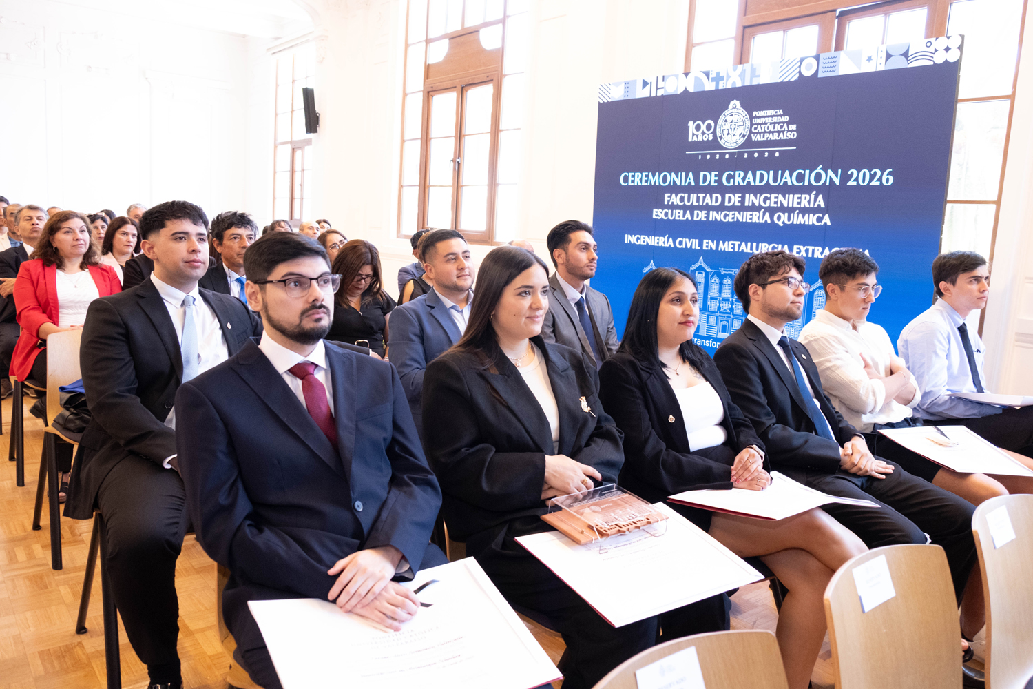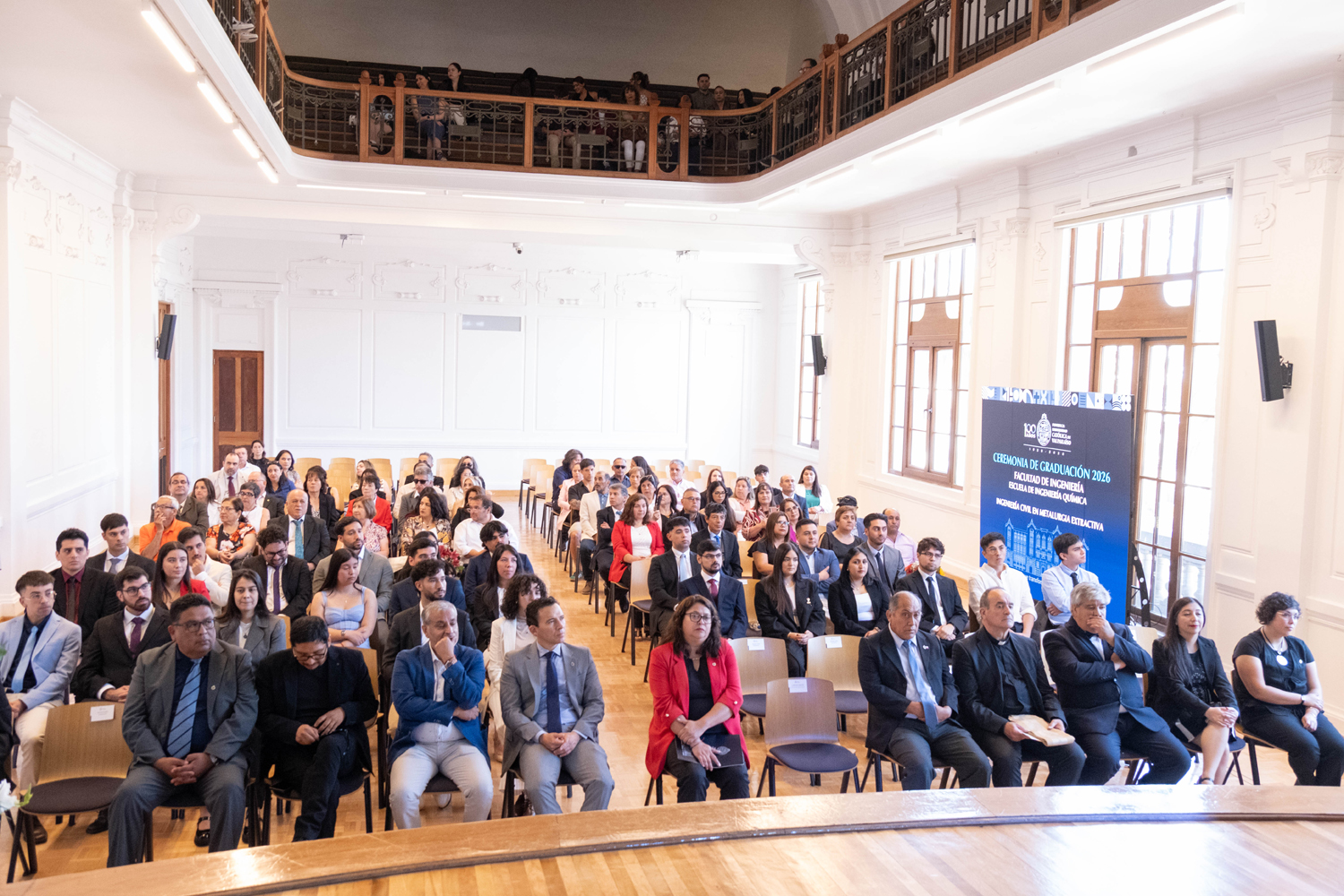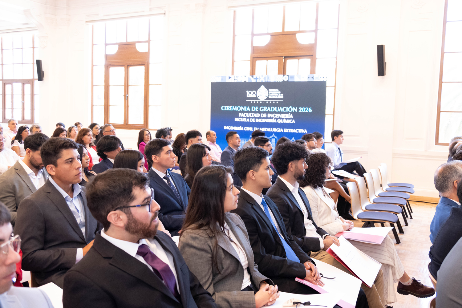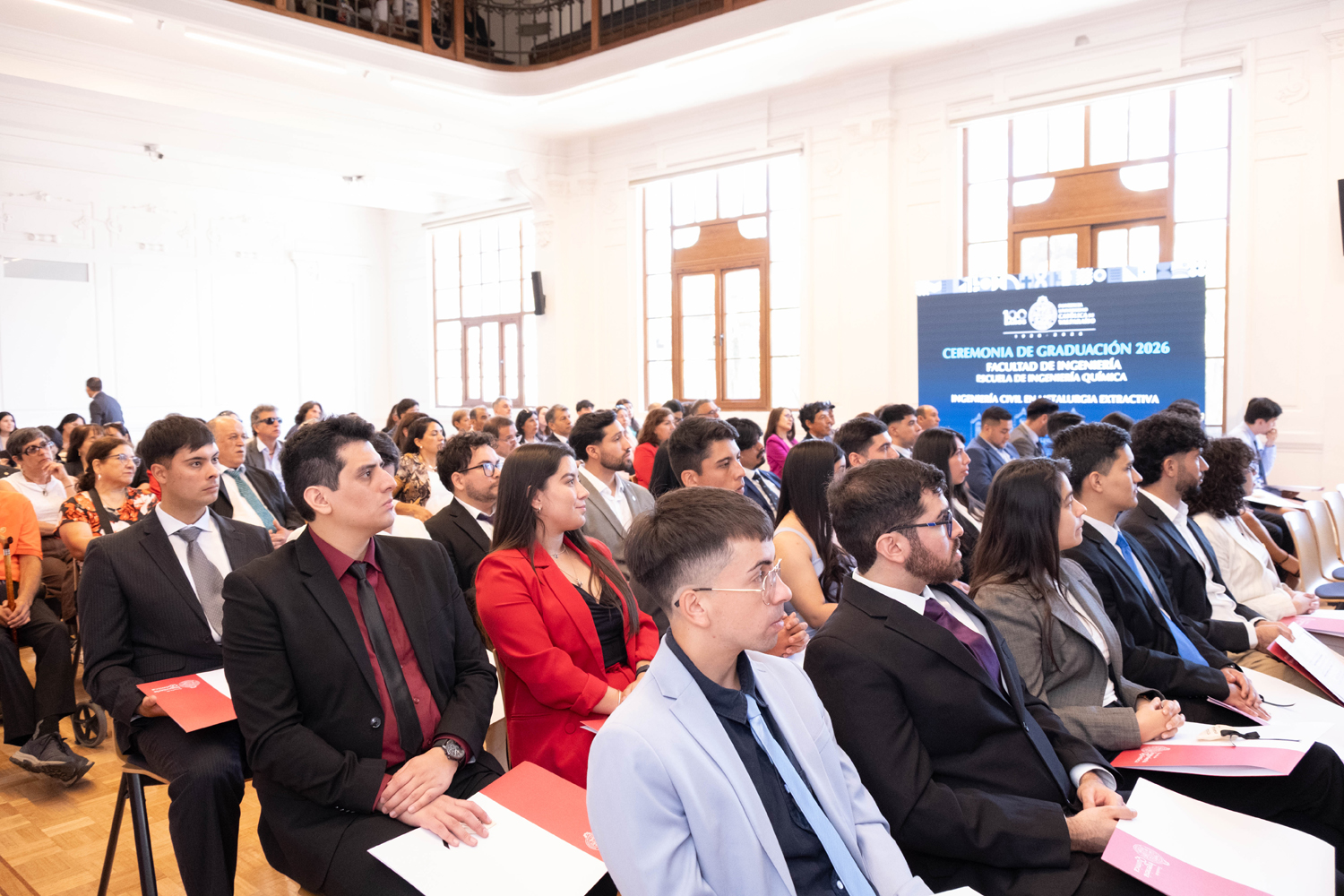 La jornada del miércoles 14 de enero estuvo marcada por la titulación de 49 egresados y egresadas de Ingeniería Civil Química. Posteriormente, el jueves 15 de enero se realizó la ceremonia correspondiente a Ingeniería Civil en Metalurgia Extractiva, en la que 29 profesionales recibieron sus diplomas. Finalmente, el viernes 16 de enero se tituló a 46 nuevos profesionales de Ingeniería Civil de Minas.
