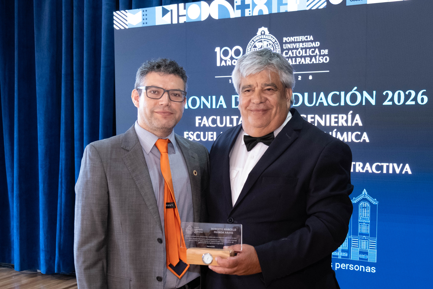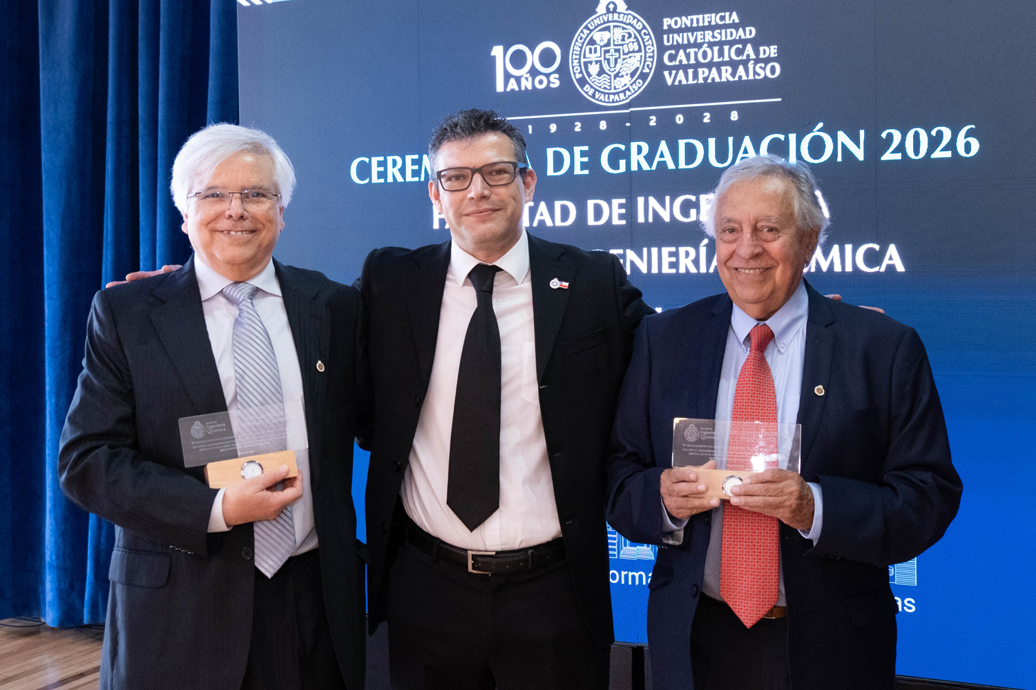 Durante las ceremonias de Ingeniería Civil en Metalurgia Extractiva e Ingeniería Civil de Minas, se llevó a cabo un emotivo reconocimiento a académicos que culminan un importante ciclo como docentes de la Escuela de Ingeniería Química. En esta instancia fueron destacados el profesor Roberto Parada, de Ingeniería Civil en Metalurgia Extractiva, y los profesores Guillermo Bagioli, Carlos Patricio Bolados y Álex Carpanetti, de Ingeniería Civil de Minas.