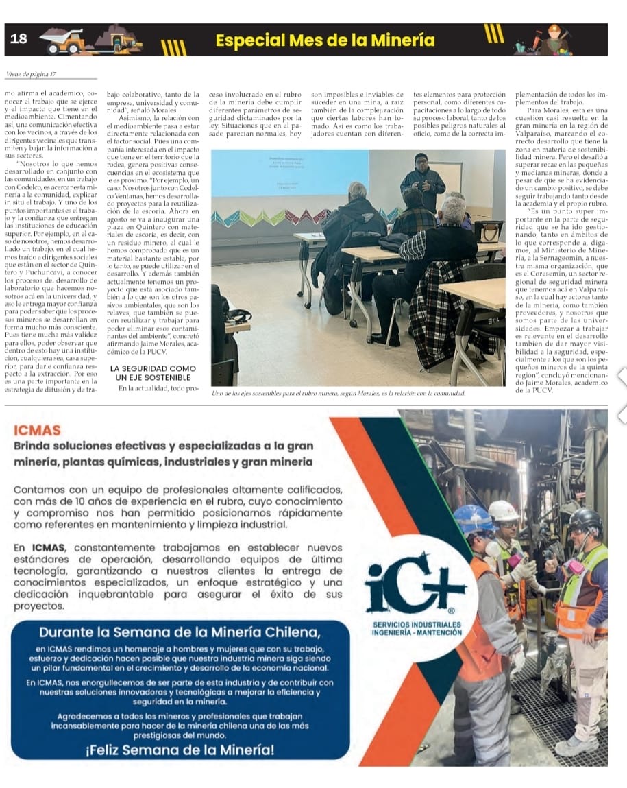 En la edición especial del “Mes de la Minería” del diario “El Observador”, el profesor de la Escuela de Ingeniería Química y director del Centro de Minería de la PUCV, Jaime Morales, explicó cuáles son las claves que convierten un rubro como el minero, en sustentable y cómo se logra ello.