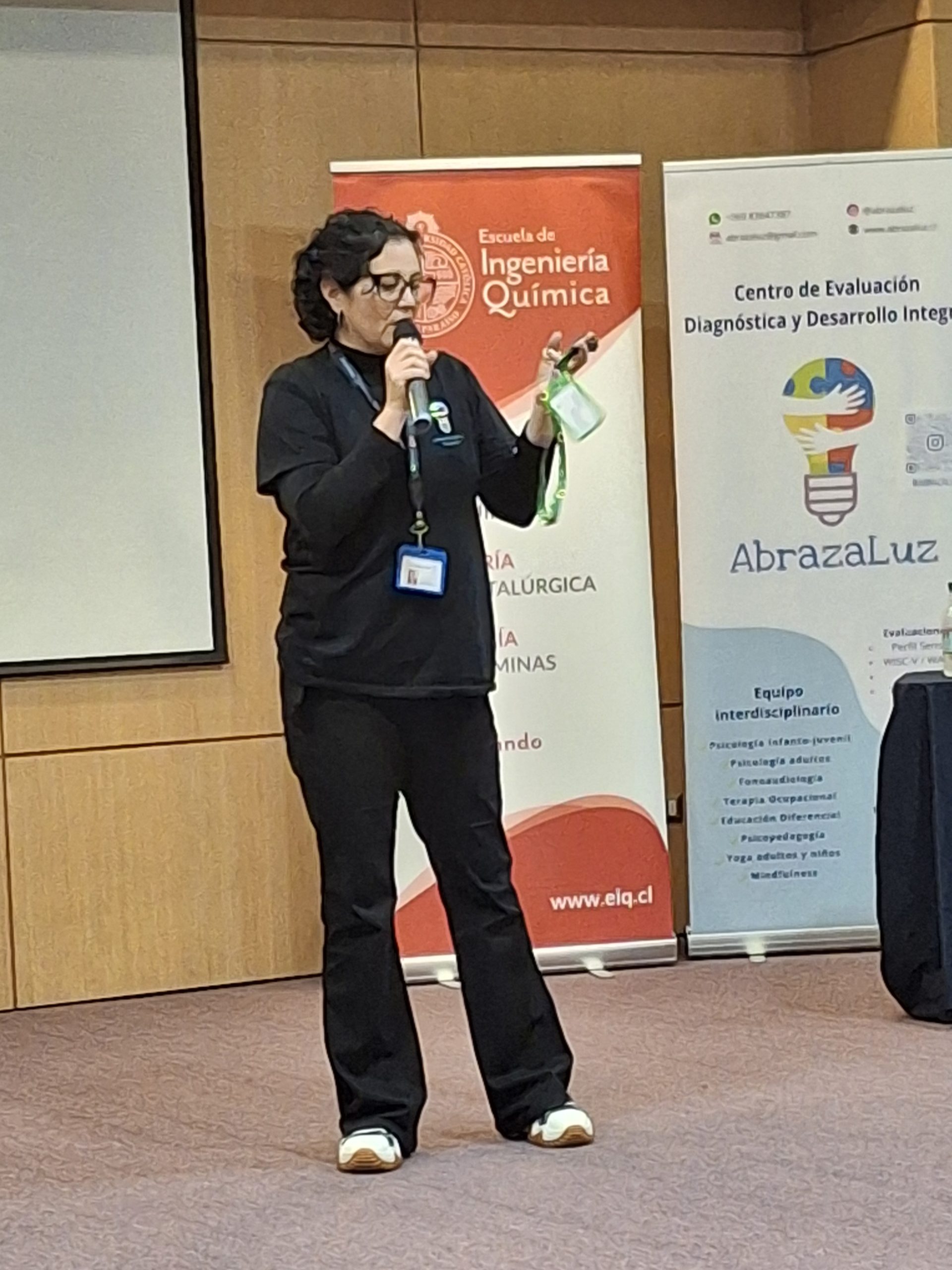 Al inicio de la charla, se entregaron diversos elementos sensoriales a los asistentes, con el objetivo de fomentar la toma de conciencia sobre los distintos perfiles sensoriales. Además, se invitó a los participantes a escanear un código QR para identificar sus propios perfiles, cuyos resultados serían posteriormente analizados y enviados por correo. Se explicó que, si bien un perfil sensorial alterado no implica necesariamente neurodivergencia, sí constituye una base importante para comprenderla.