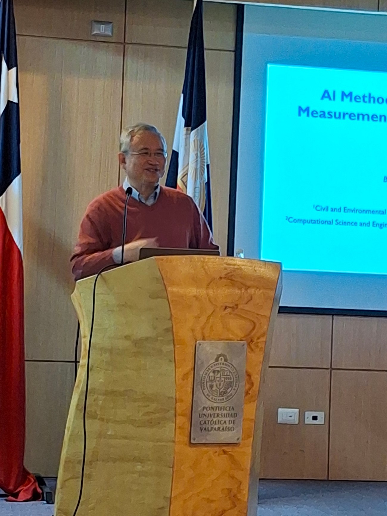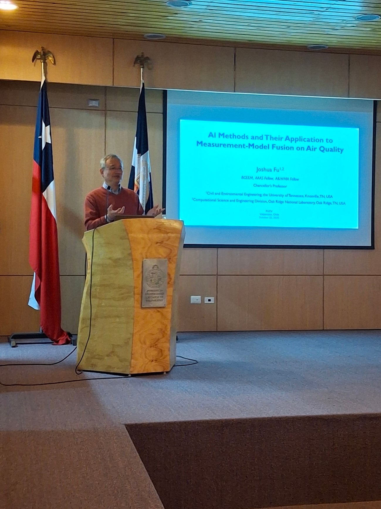 El miércoles 22 de octubre se realizó en el Auditorio de la Facultad de Ingeniería de la PUCV de Valparaíso la charla magistral titulada “AI on air quality and weather forecasts”, dictada por el Dr. Joshua S. Fu, académico del University of Tennessee, USA.