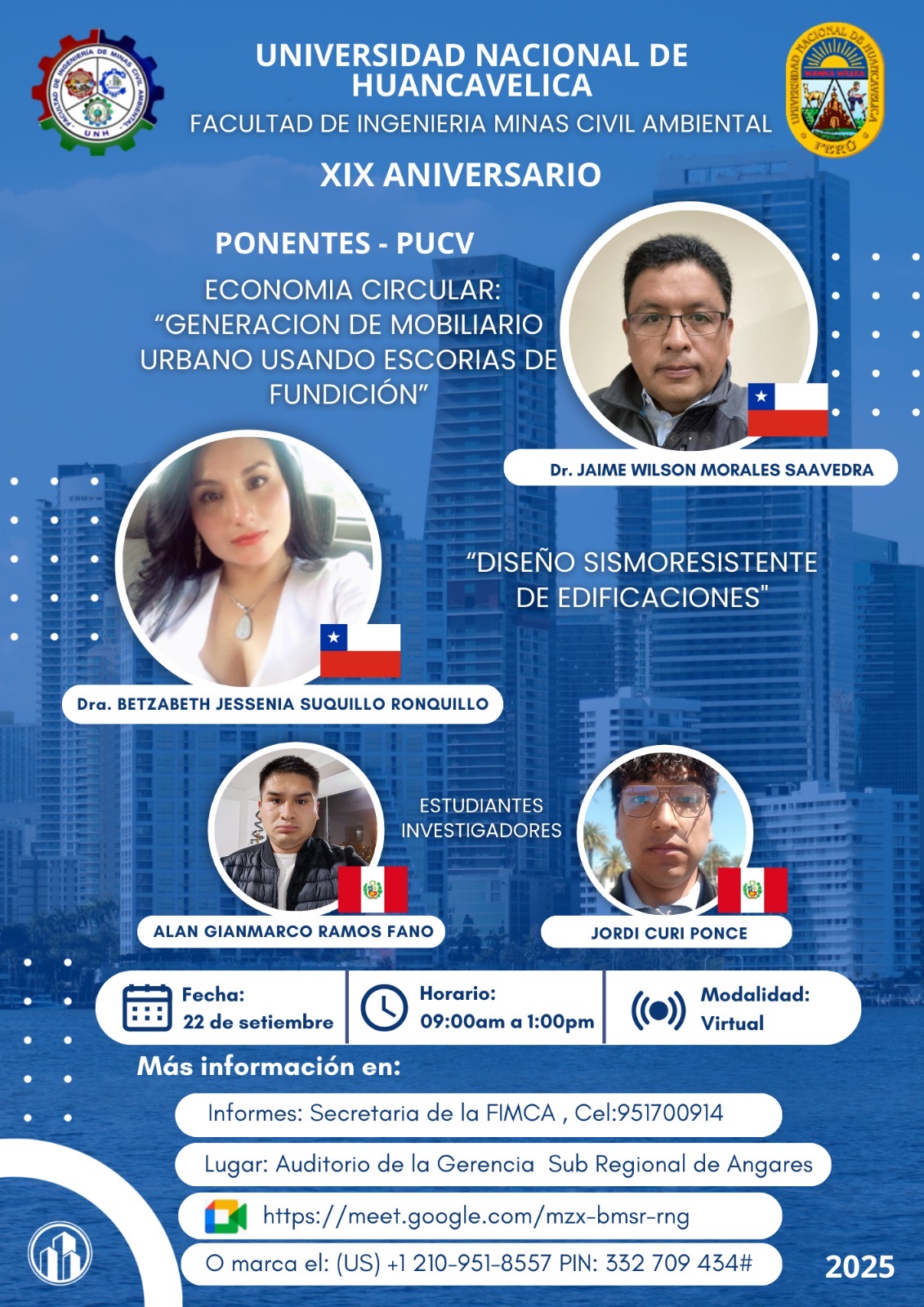 En el marco de su XIX aniversario, la Facultad de Ingeniería de Minas Civil Ambiental (FIMCA) de la Universidad Nacional de Huancavelica, Perú, desarrolló una jornada académica con destacados expositores de la PUCV, entre ellos el Dr. Jaime Morales, quien presentó la ponencia “Economía circular: generación de mobiliario urbano usando escorias de fundición”.