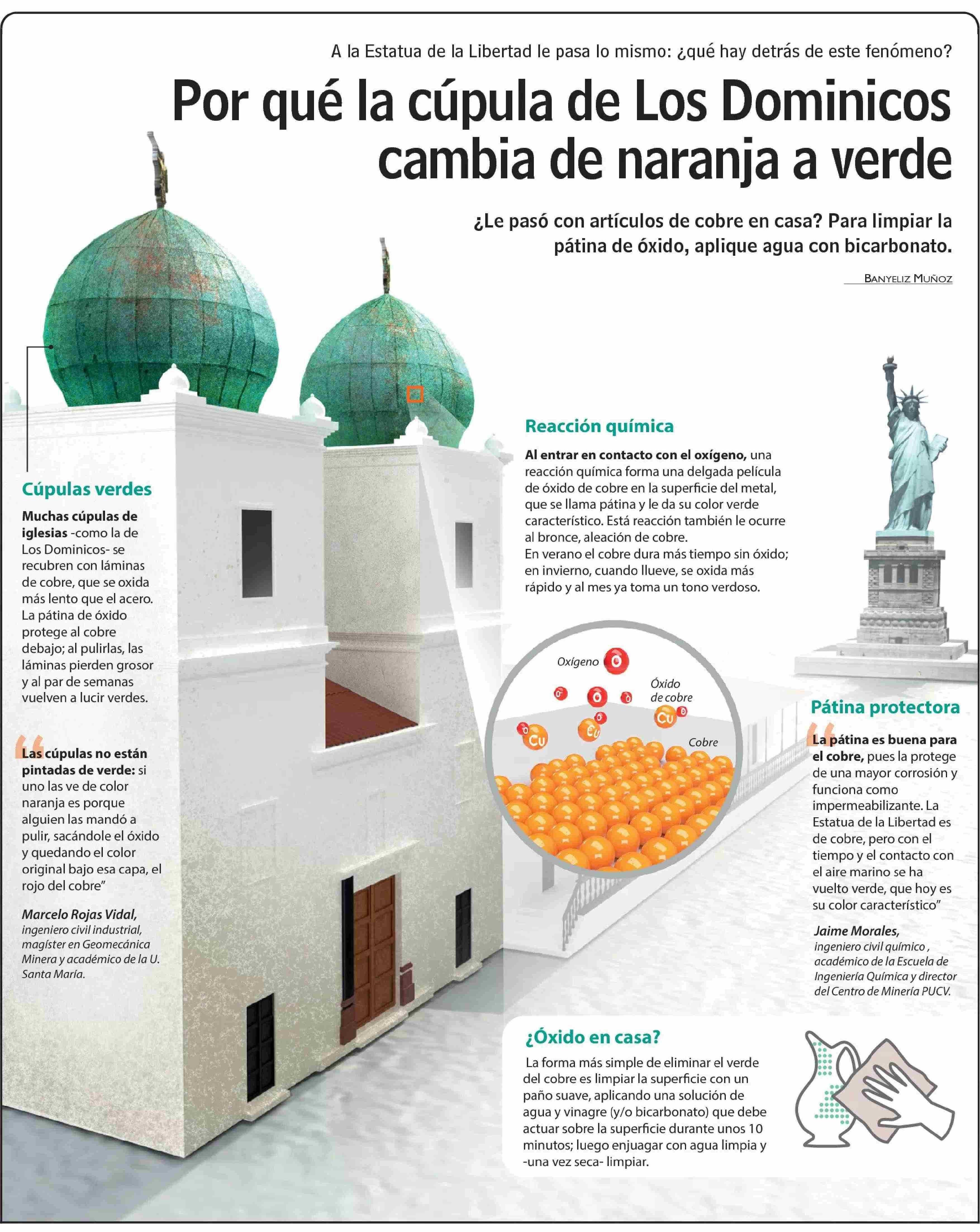 En la nota se aborda el cambio de color naranja a verde en las cúpulas de la Iglesia de Los Dominicos, ubicada en la comuna de Las Condes, Región Metropolitana, las que están recubiertas de una lámina de cobre que, al entrar en contacto con oxígeno, genera una reacción química, formando una delgada película de óxido de cobre en la superficie del metal, llamada pátina, y que le da su color verde característico.