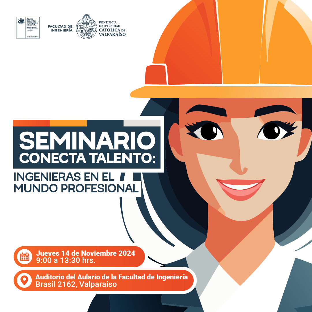La Facultad de Ingeniería de la Pontificia Universidad Católica de Valparaíso, invita a participar en el seminario “Conecta Talento: Ingenieras en el Mundo Profesional” . Este evento está organizado por las académicas de la Escuela de Ingeniería en Construcción y Transporte, el Área de Participación y Liderazgo Femenino, y el Área de Innovación y Vinculación con la Industria de la Facultad de Ingeniería PUCV.