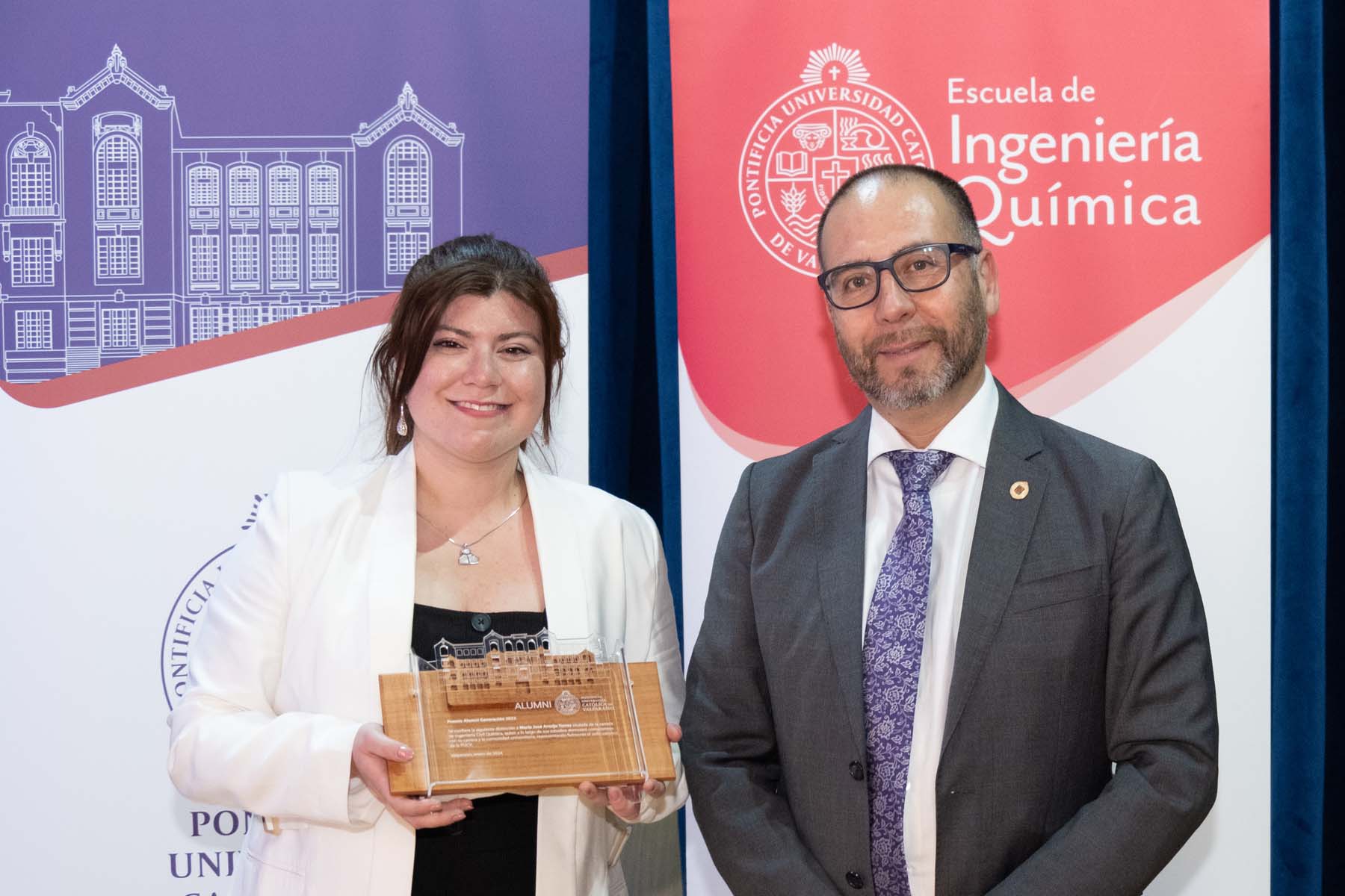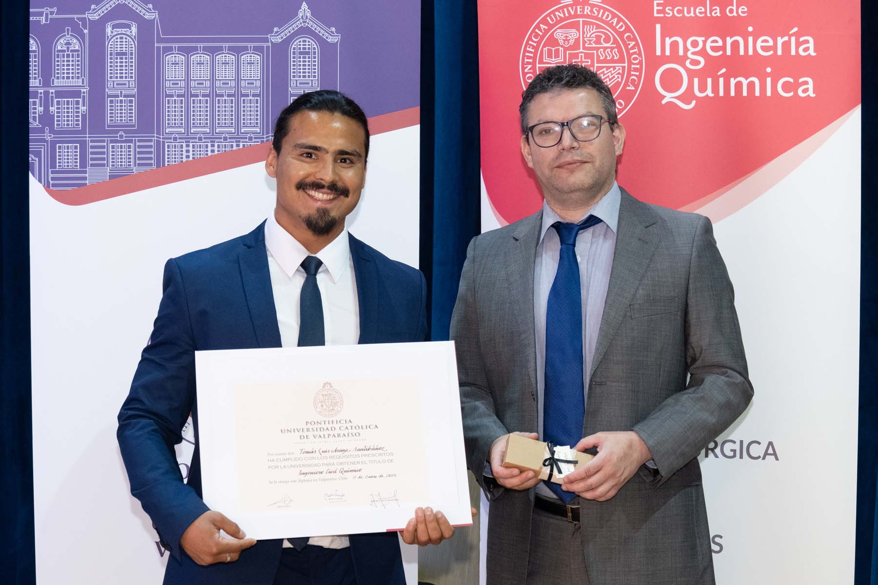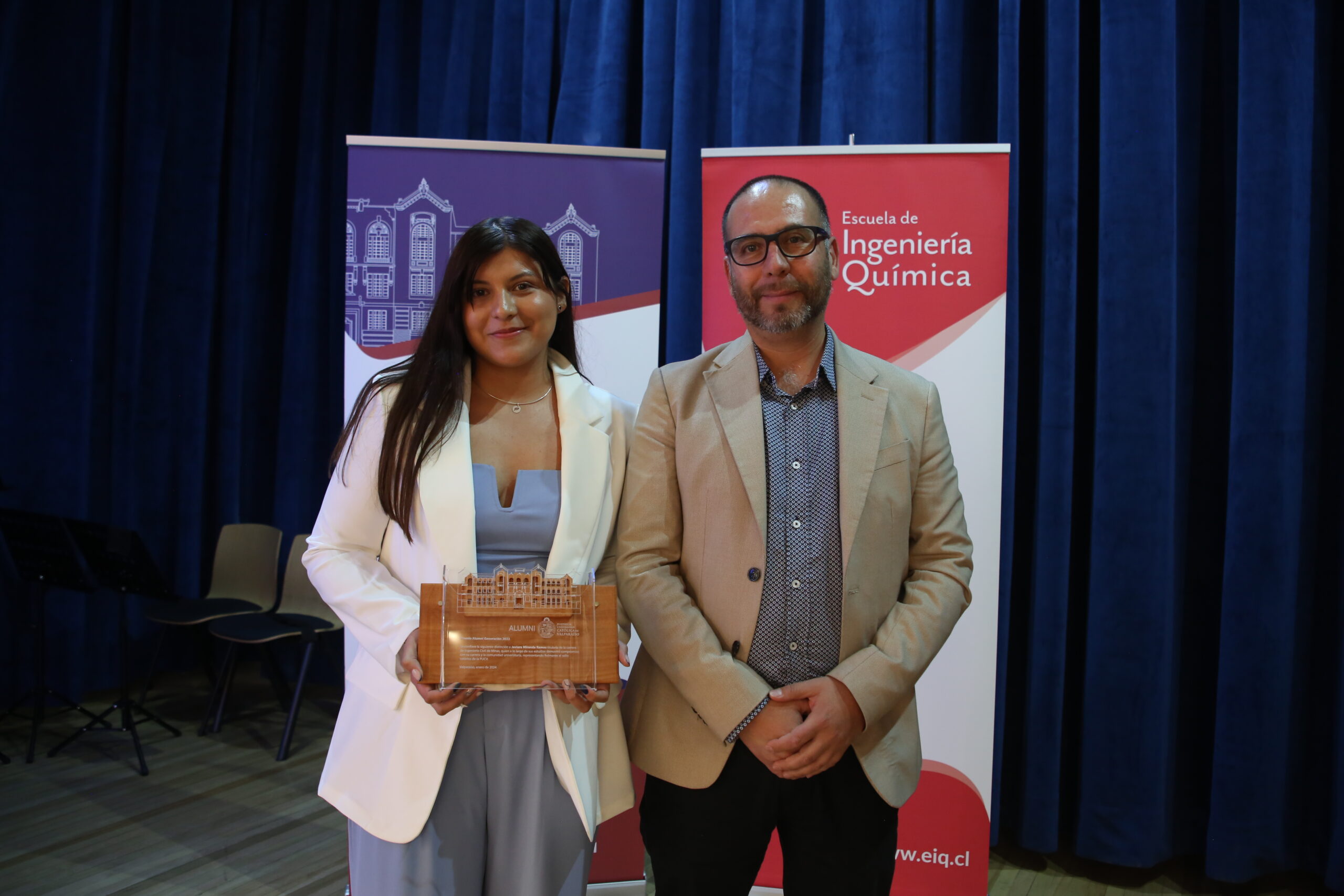 El jueves 18 de enero fue el turno de la carrera de Ingeniería Civil Química, ceremonia donde 42 egresados obtuvieron su título profesional. En la ocasión, el premio al mejor graduado de su generación fue para Simón Elías Medina Alarcón, mientras que el premio Alumni Generación 2023 de Ingeniería Civil Química fue para María José Belén Armijo Torres.