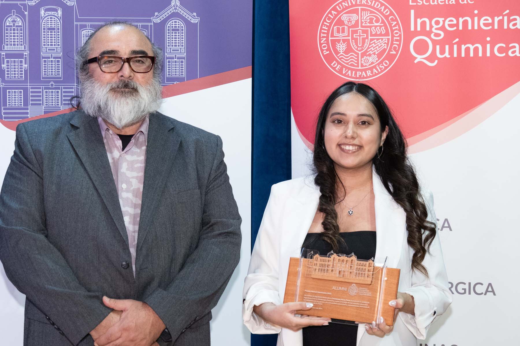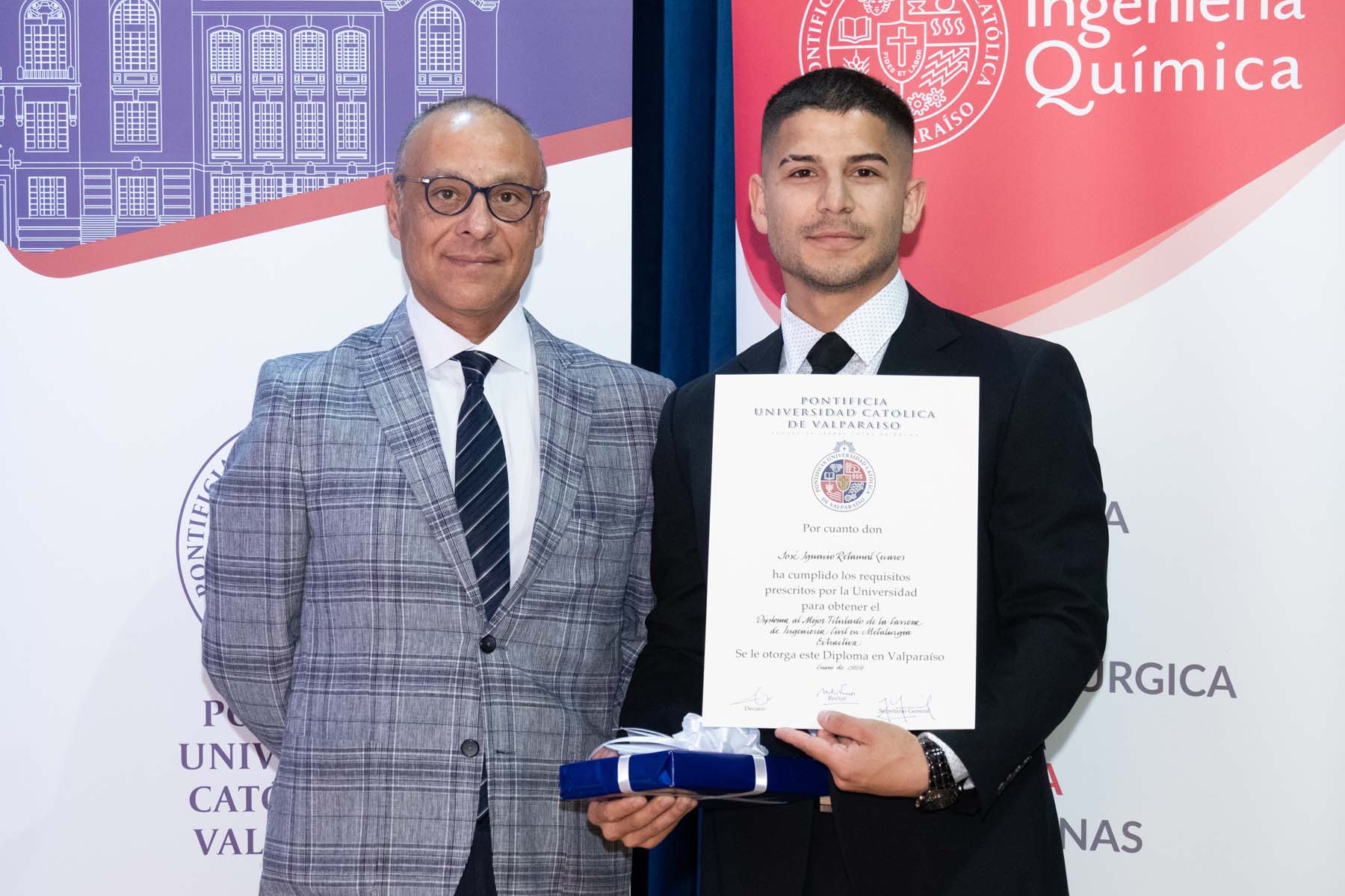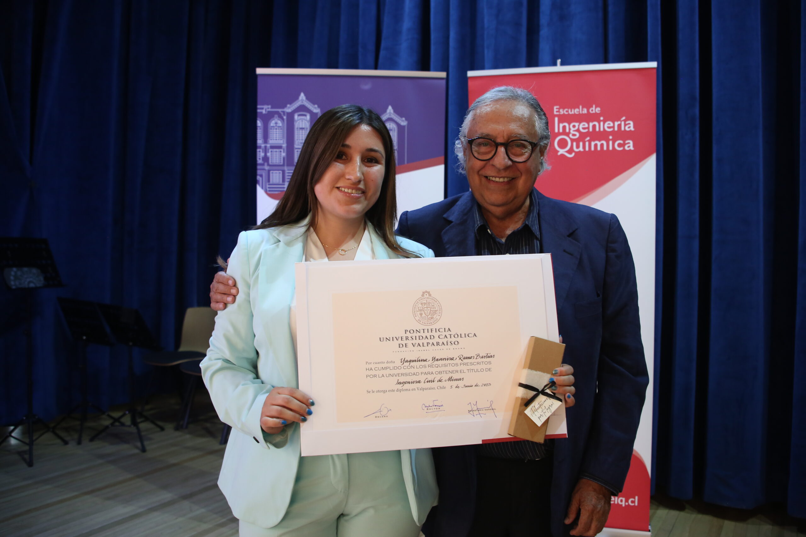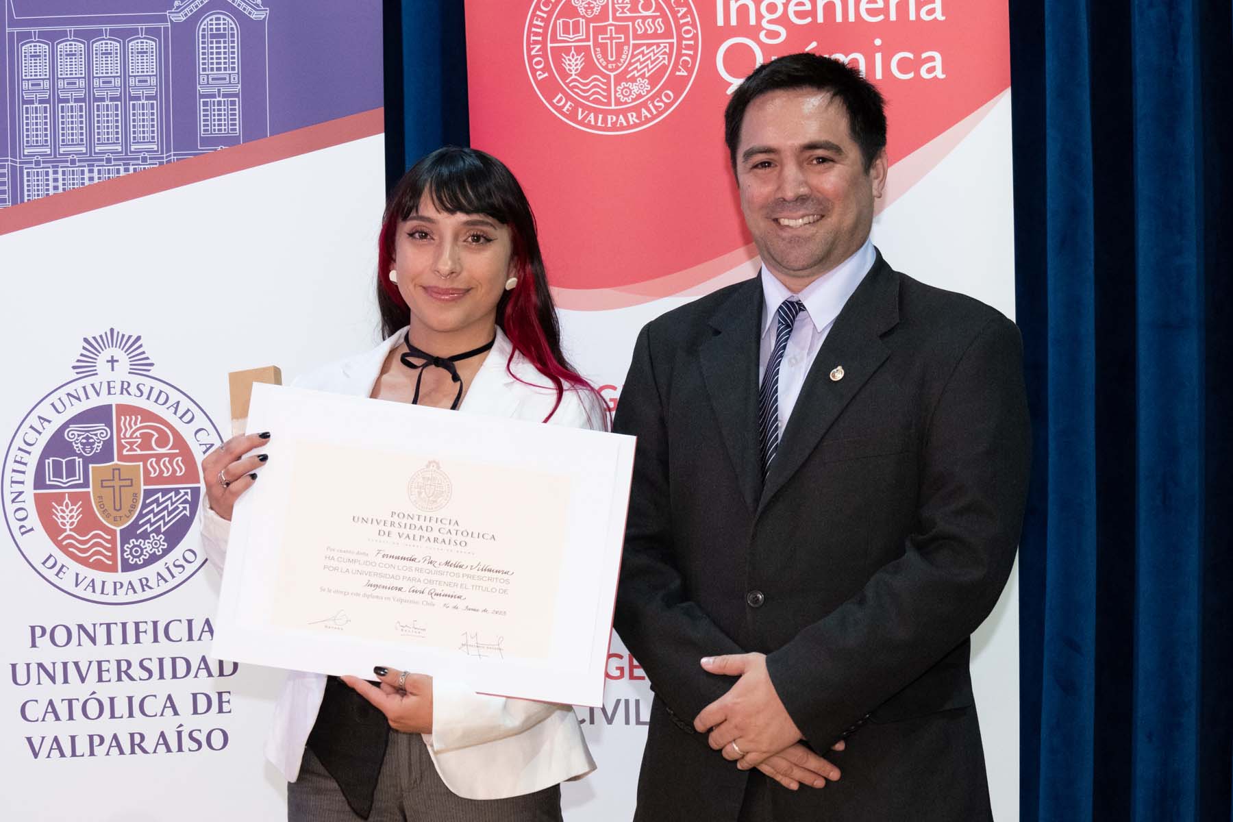 El jueves 18 de enero fue el turno de la carrera de Ingeniería Civil Química, ceremonia donde 42 egresados obtuvieron su título profesional. En la ocasión, el premio al mejor graduado de su generación fue para Simón Elías Medina Alarcón, mientras que el premio Alumni Generación 2023 de Ingeniería Civil Química fue para María José Belén Armijo Torres.
