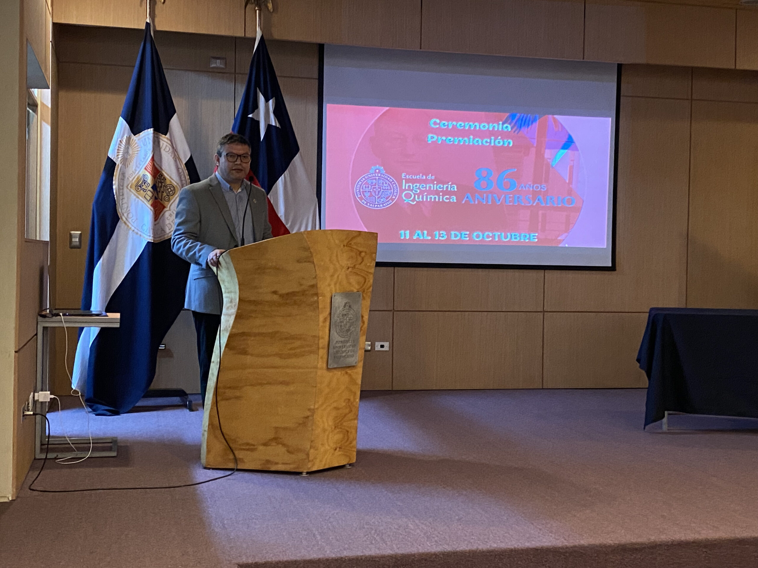 La ceremonia se inició con las palabras del director de la Escuela de Ingeniería Química, Sr. Carlos Carlesi, quien realizó una breve reseña histórica sobre la universidad y los inicios de la EIQ.