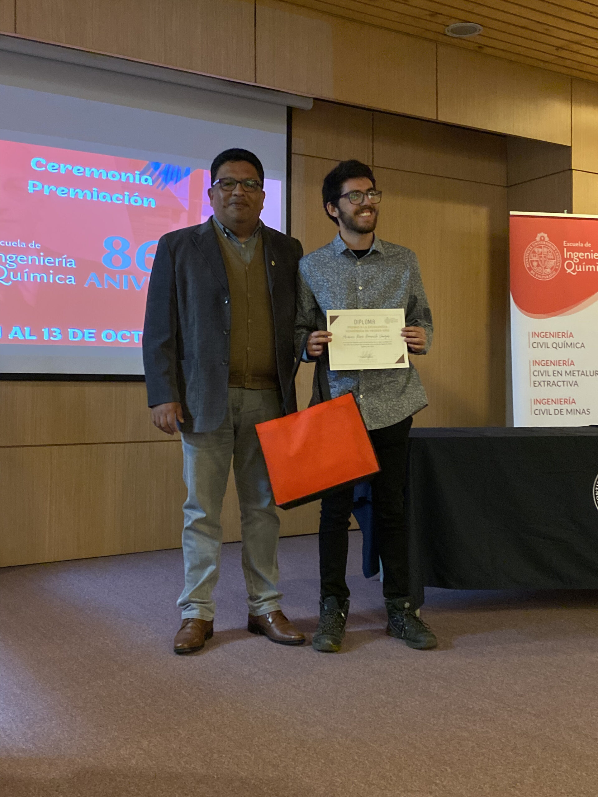 Durante la actividad además se llevó a cabo la premiación de los mejores estudiantes por carrera año 2022, premios entregados por el secretario académico de la EIQ, Sr. Jaime Morales, y que recayeron en Américo Raurich de Ingeniería Civil Química; Martina Noguera de Ingeniería Civil de Minas; y Eduardo Espinoza de Ingeniería Civil en Metalurgia Extractiva.